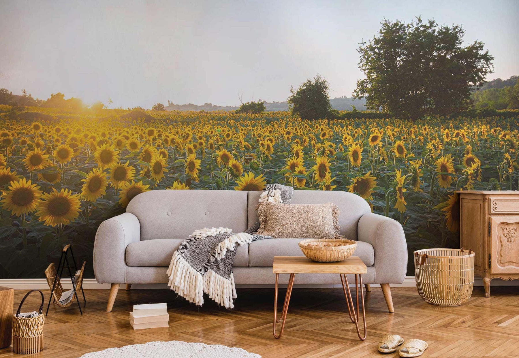 Check out this Sunny Sunflowers Wall Mural for an instant summery vibe in any space in your home. Transform your boring white walls into a colourful splash of colour with a yellow and green sunflower field wall mural.