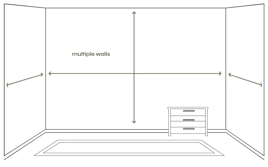 For complex projects and multiple walls, don't hesitate to request a rendering from our design team! It will give you a good idea of which sections of the wall mural will be visible and which will be trimmed off. We can also adjust the design to fit the best way possible on yoru wall.