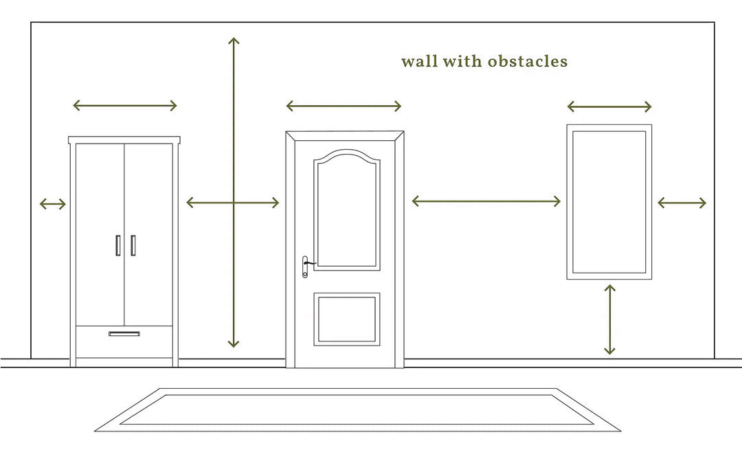 Not all walls are perfectly straight. For this reason, it is important to take measurements at 2 different points. For the width, take measurements at the top and bottom of the wall. For the height, take measurements on the left and right hand sides of the wall.