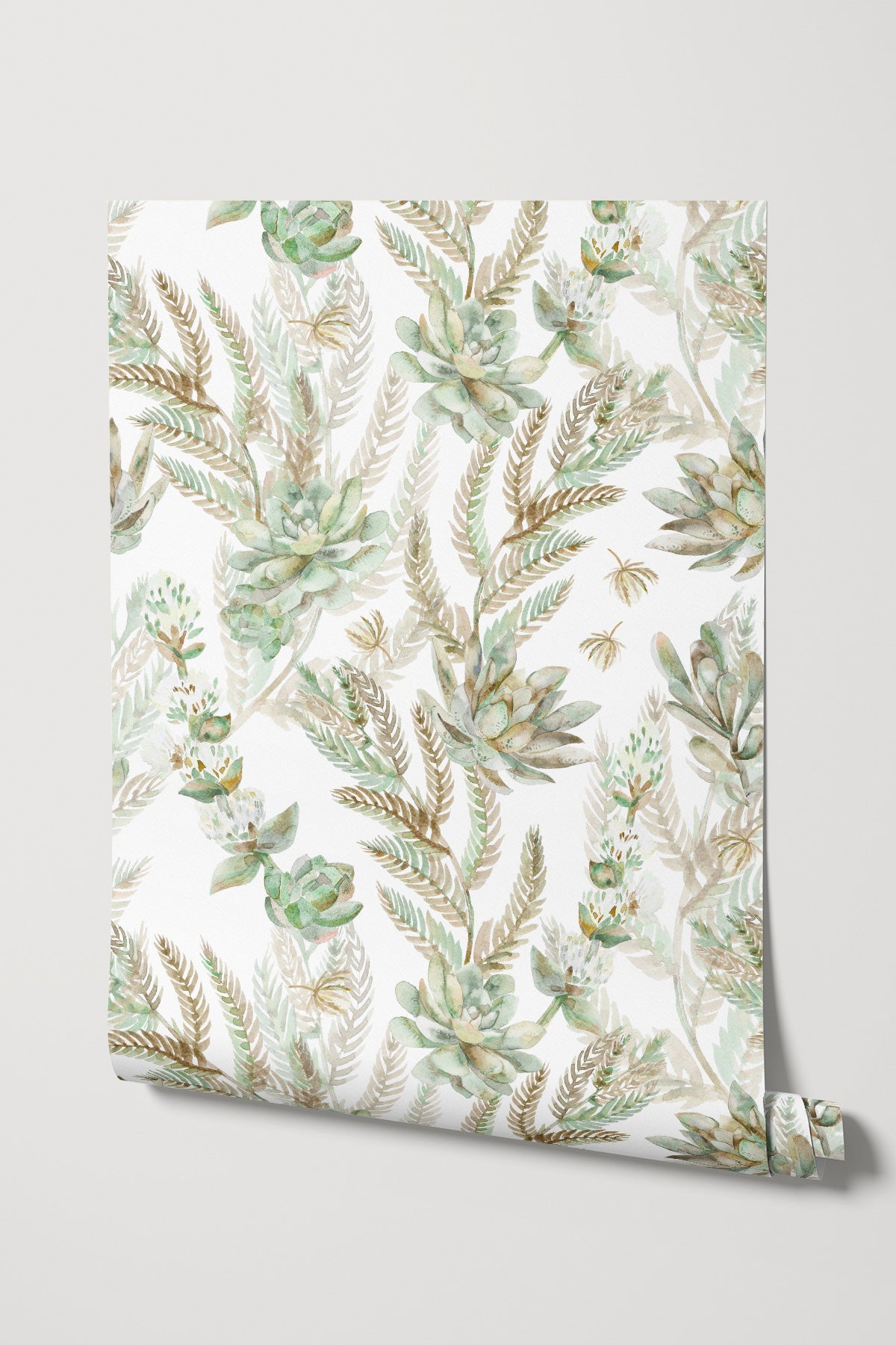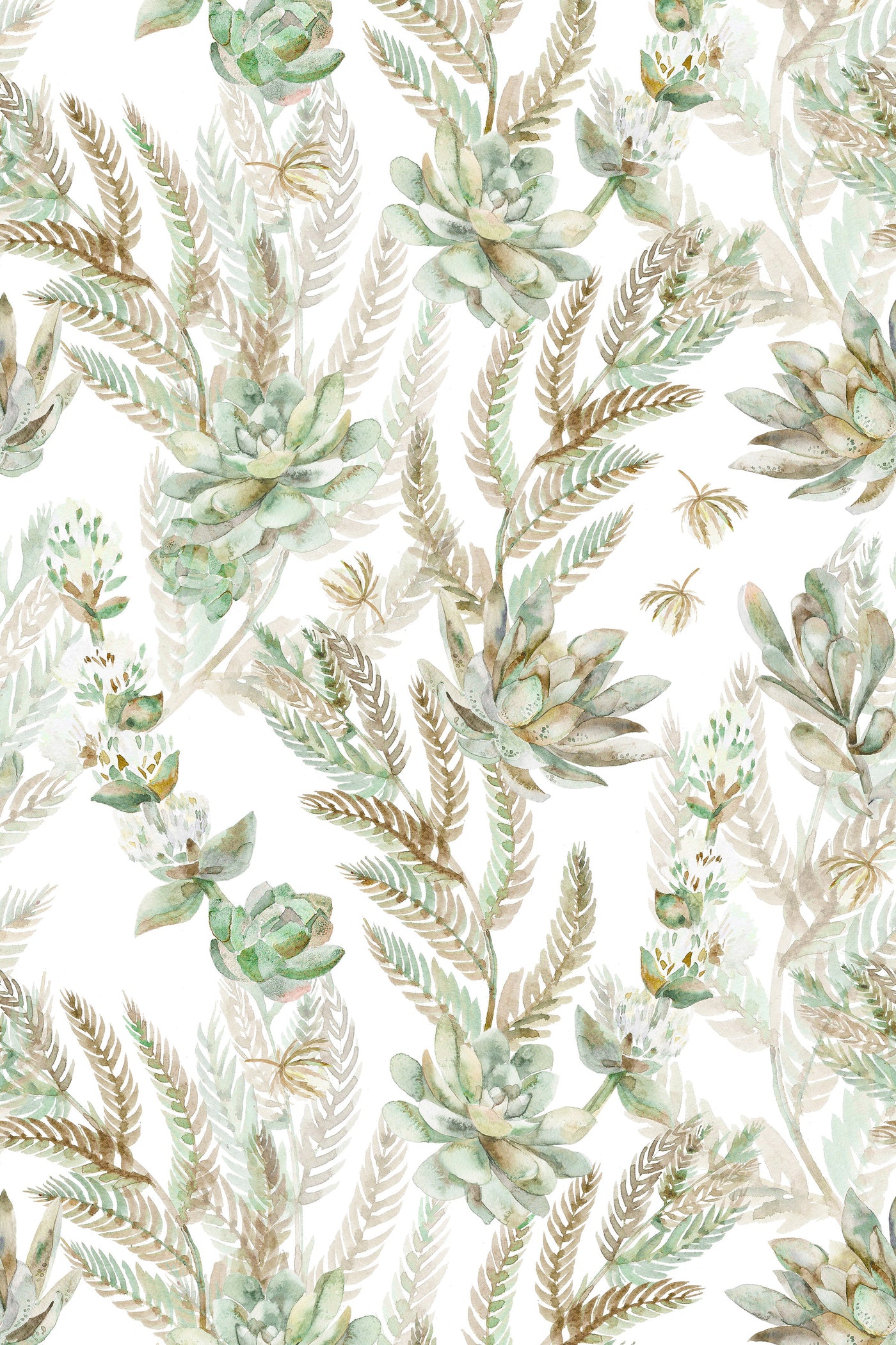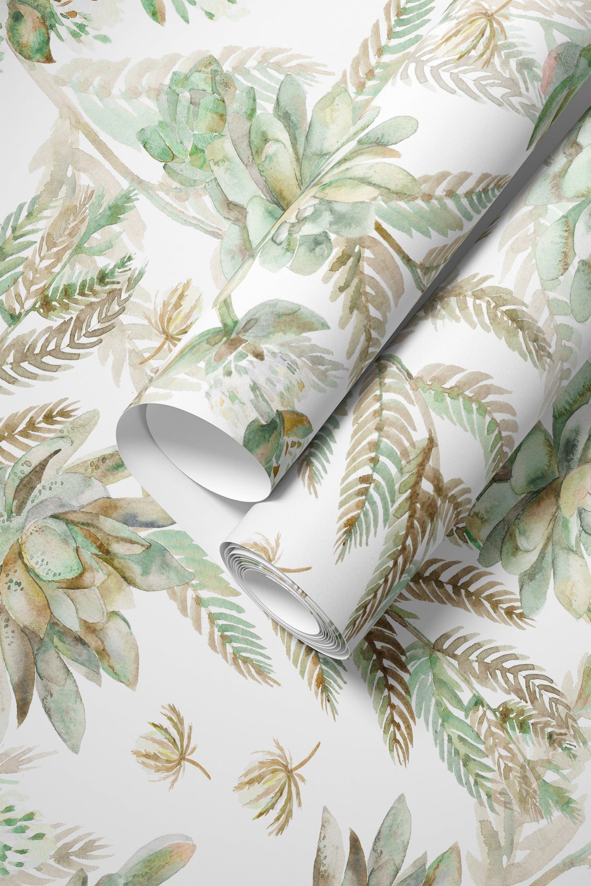 Camilla wallpaper is a captivating pattern that harmoniously blends a medley of plants in a stunning watercolor style. This unique design transforms your living spaces into a lush sanctuary where nature's diversity is celebrated. The carefully rendered plants, each with its distinct form and character, come to life through the fluid strokes of watercolor, creating a visually enchanting wallpaper. "Camilla wallpaper is a botanical symphony.