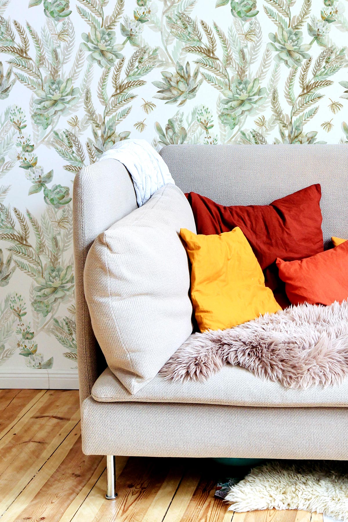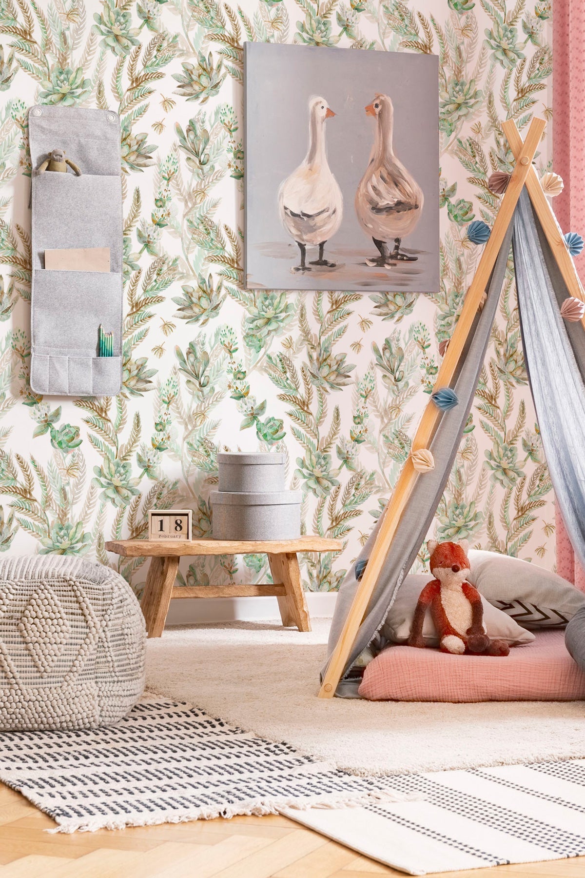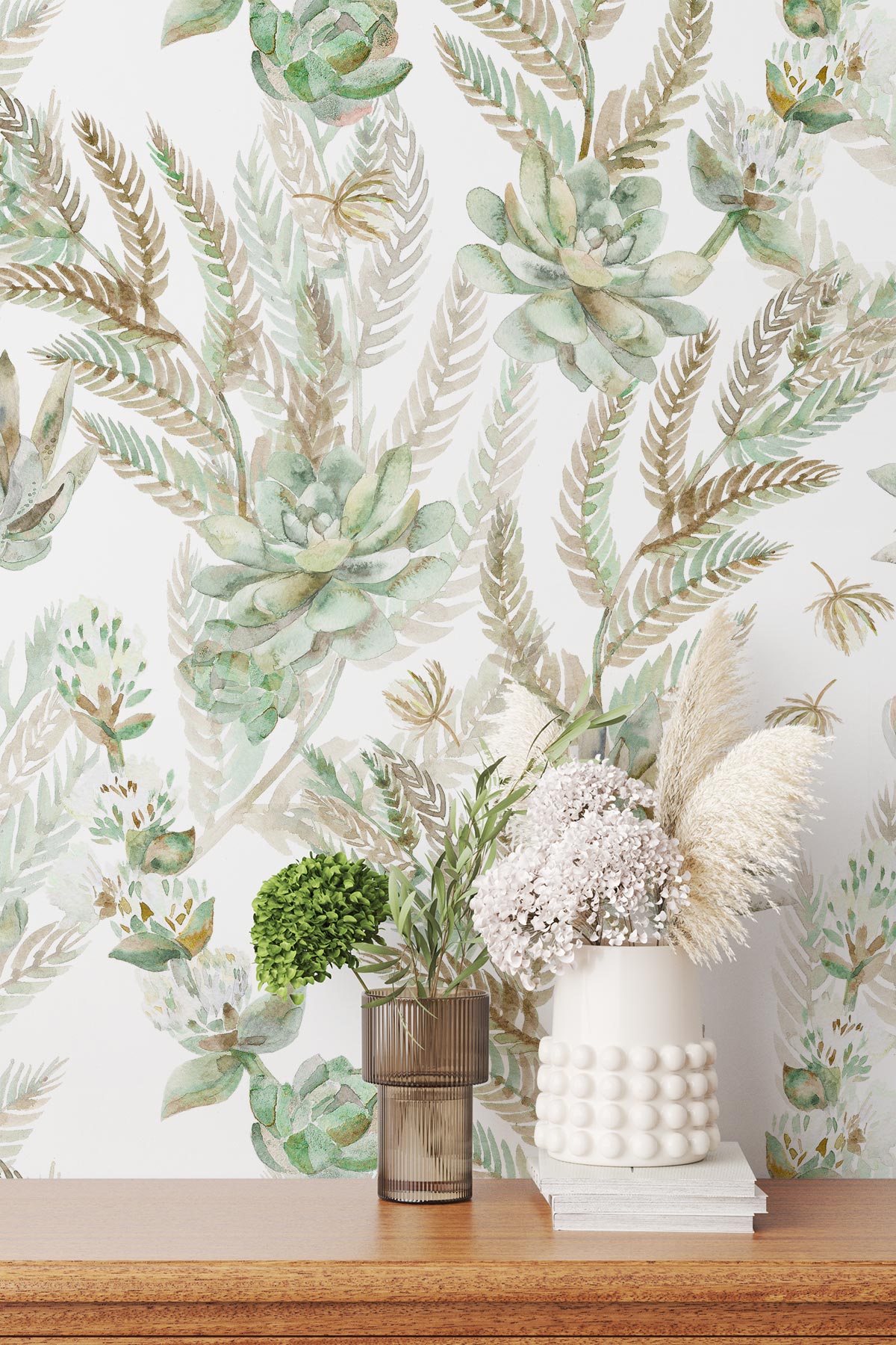 Camilla wallpaper is a captivating pattern that harmoniously blends a medley of plants in a stunning watercolor style. This unique design transforms your living spaces into a lush sanctuary where nature's diversity is celebrated. The carefully rendered plants, each with its distinct form and character, come to life through the fluid strokes of watercolor, creating a visually enchanting wallpaper. "Camilla wallpaper is a botanical symphony.