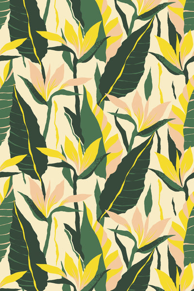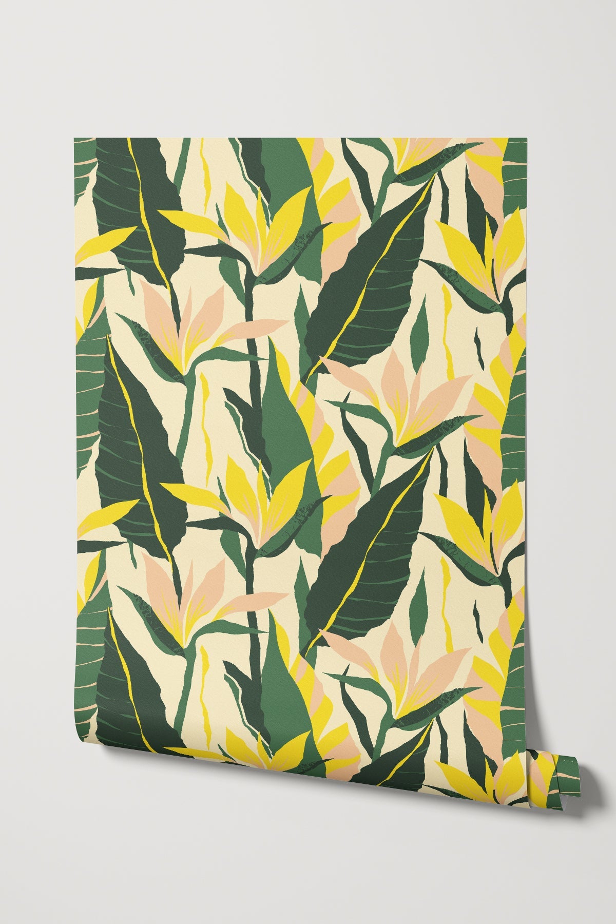 A celebration of tropical exuberance, our Curacao wallpaper bursts forth with a vibrant tapestry of exotic flora. Bold, graphic blooms intertwine with lush foliage, creating a dynamic composition that evokes the energy of a sun-drenched paradise. This large-scale design transforms any wall into a captivating mural, bringing a touch of the unexpected to your interior.