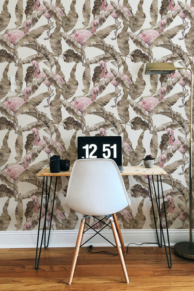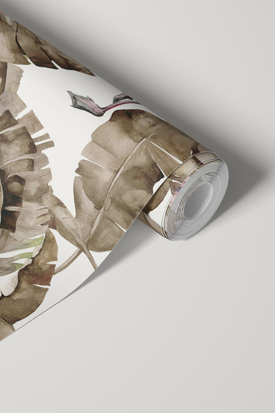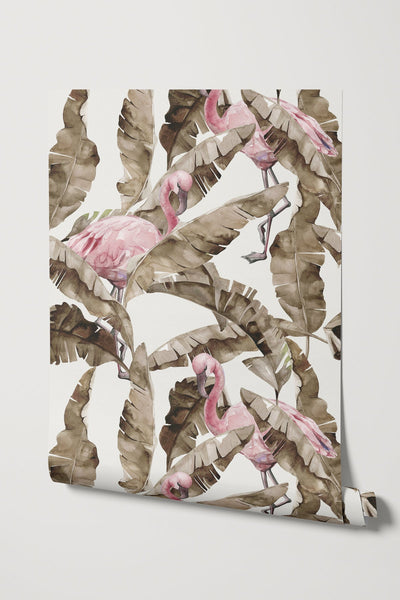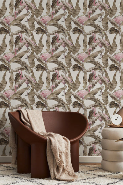 Introducing Flamingo Fiesta Wallpaper, a sophisticated fusion of natural elegance and artistic expression. This distinctive wallpaper features a harmonious intertwining of graceful flamingos and botanical banana leaves, presented in a refined watercolor style. Immerse yourself in the subtle yet captivating palette of copper and pink. The delicate detailing and expert craftsmanship make Flamingo Fiesta Wallpaper not just a wall covering but a statement of timeless style. Elevate your space with this thoughtfully designed wallpaper, where the intertwining motifs strike the perfect chord between sophistication and natural beauty.