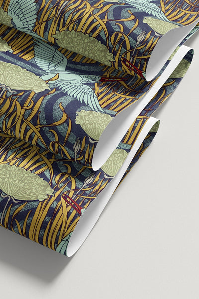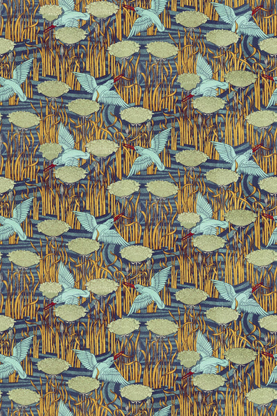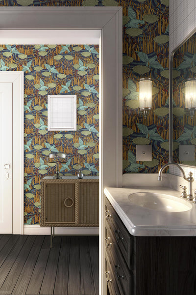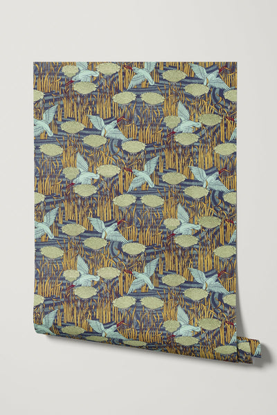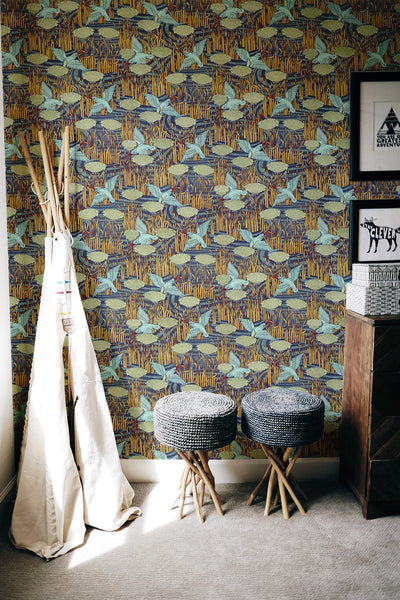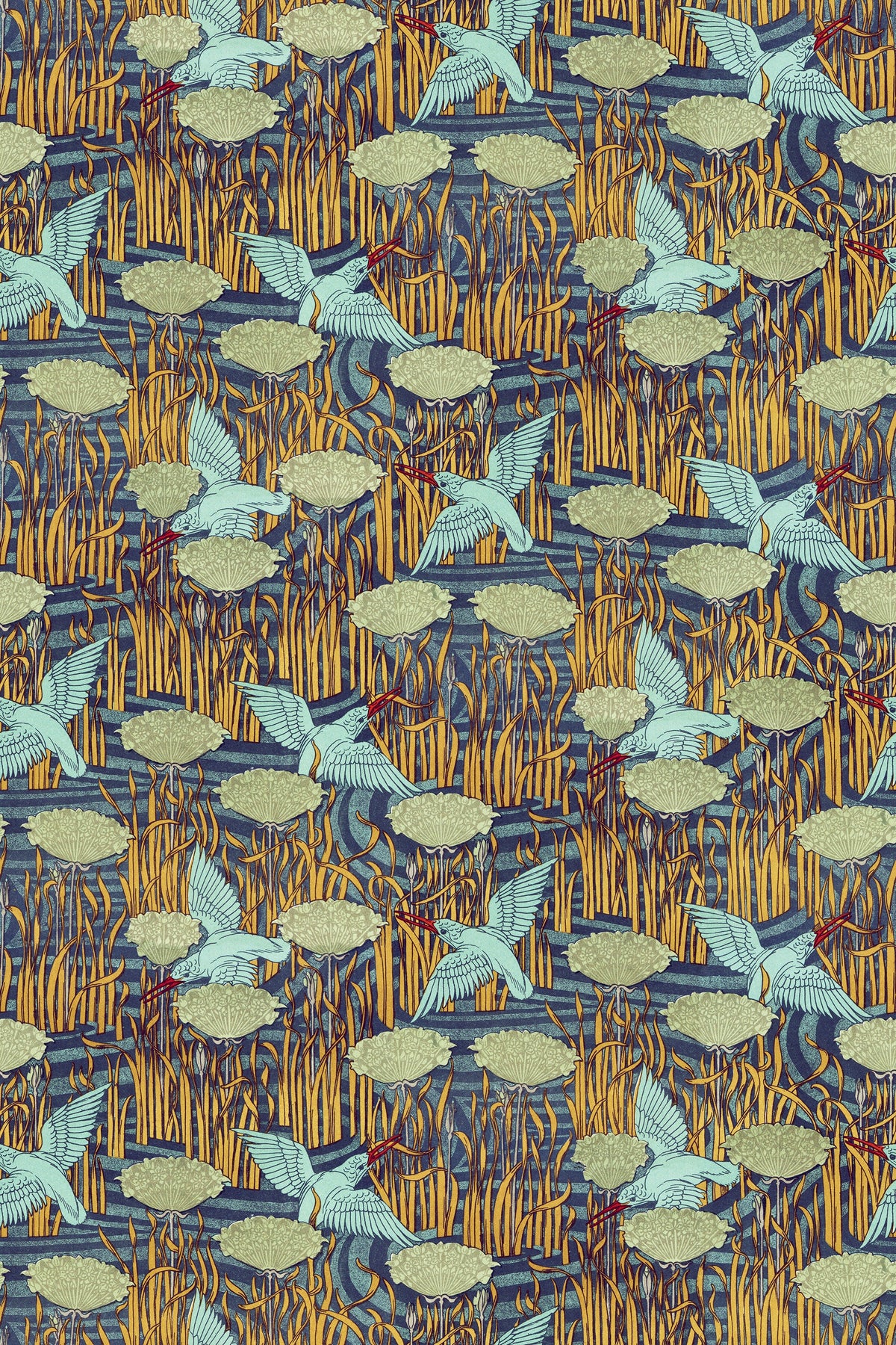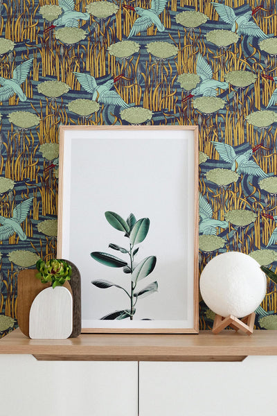 Inspired by classic vintage designs, Kingfisher Above Water brings a serene yet captivating scene into your home. This elegant wallpaper features graceful kingfishers in mid-flight, their wings poised above the delicate waters and lush, golden reeds. The interplay of cool blues, vibrant yellows, and soft greens creates a visually stunning and harmonious atmosphere that feels both timeless and fresh. The intricate detail in each bird and plant draws you into a world where nature and art seamlessly intertwine. Perfect for creating a tranquil yet striking focal point in any space, this wallpaper is ideal for living rooms, studies, or bedrooms. Let Kingfisher Above Water infuse your room with the serene beauty of nature, evoking a sense of calm and elegance in every corner.