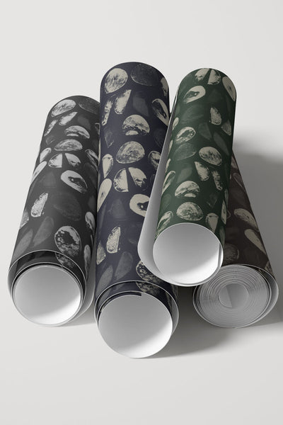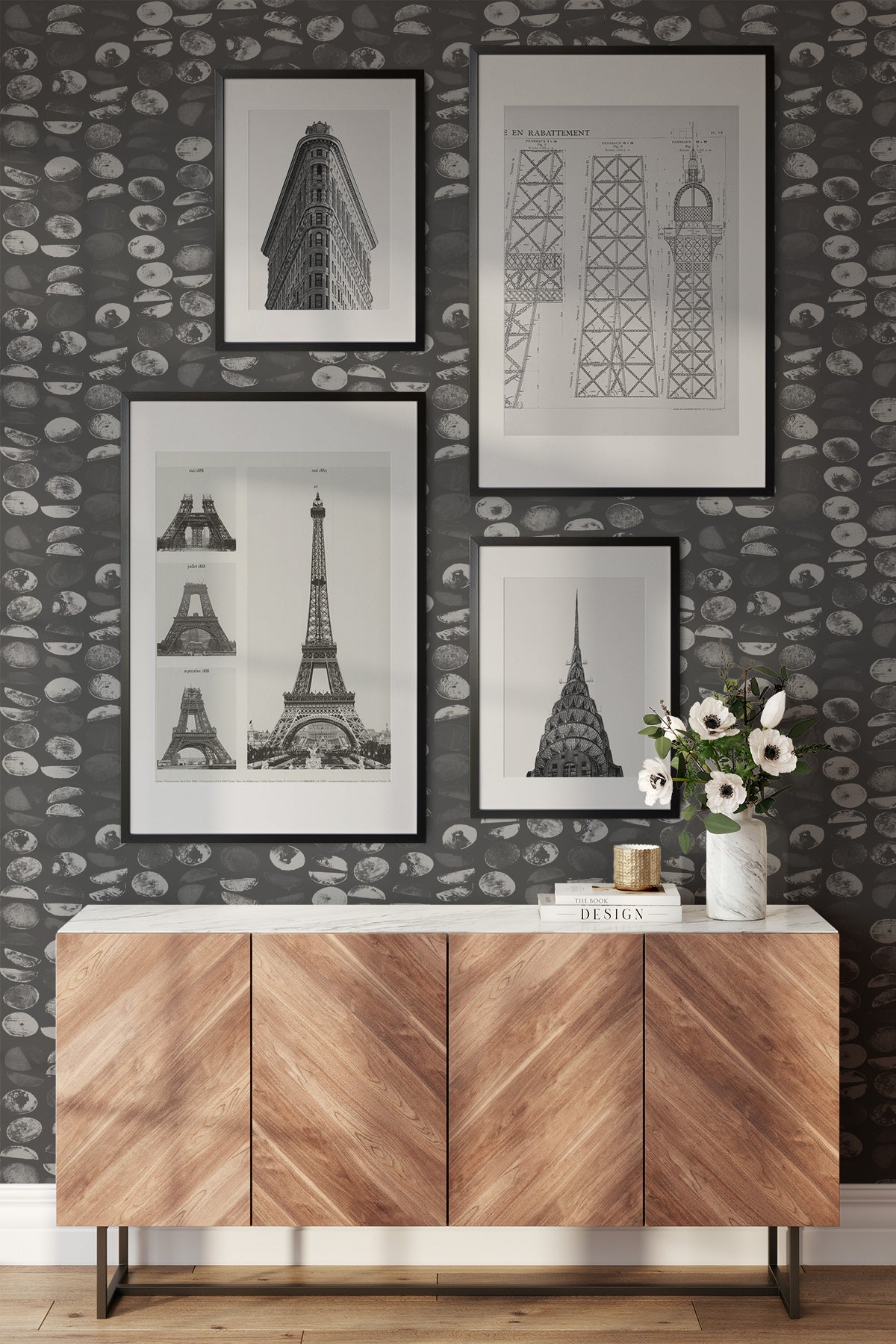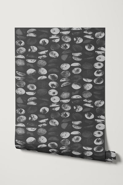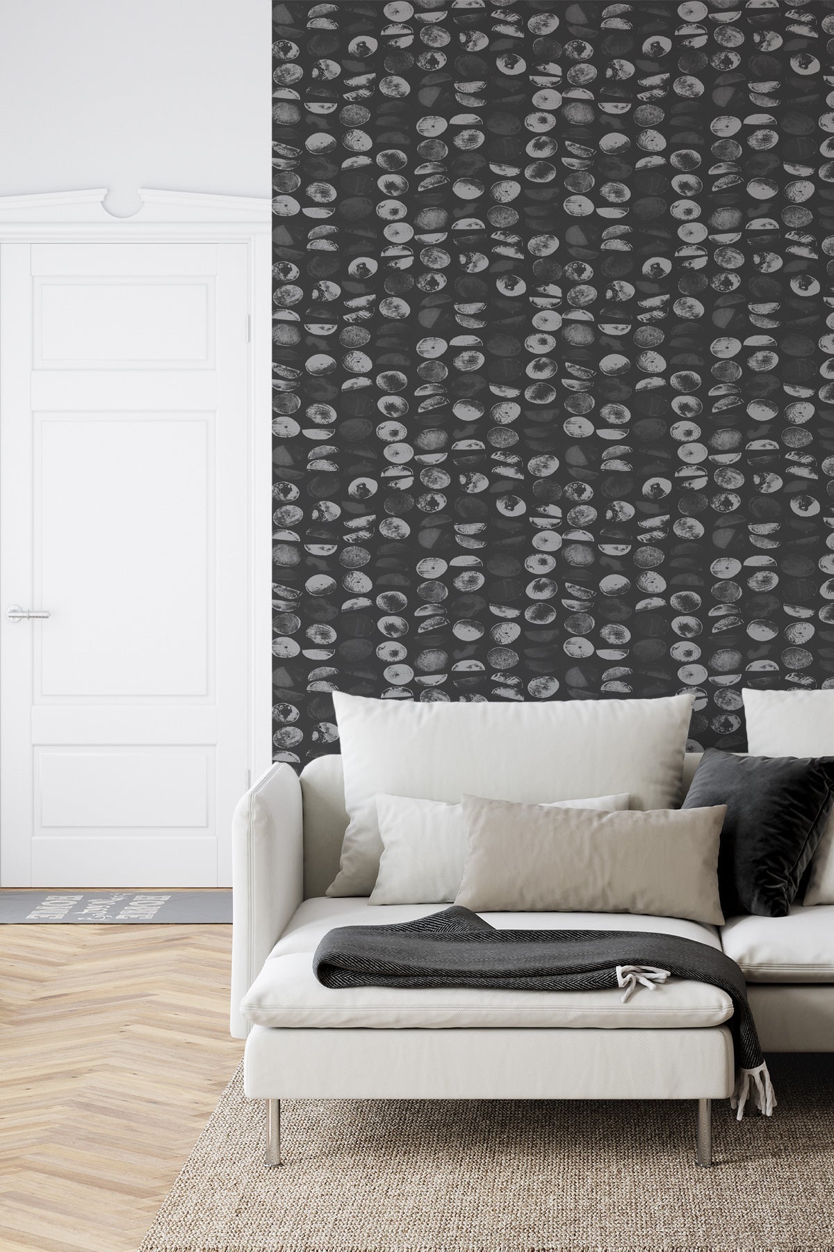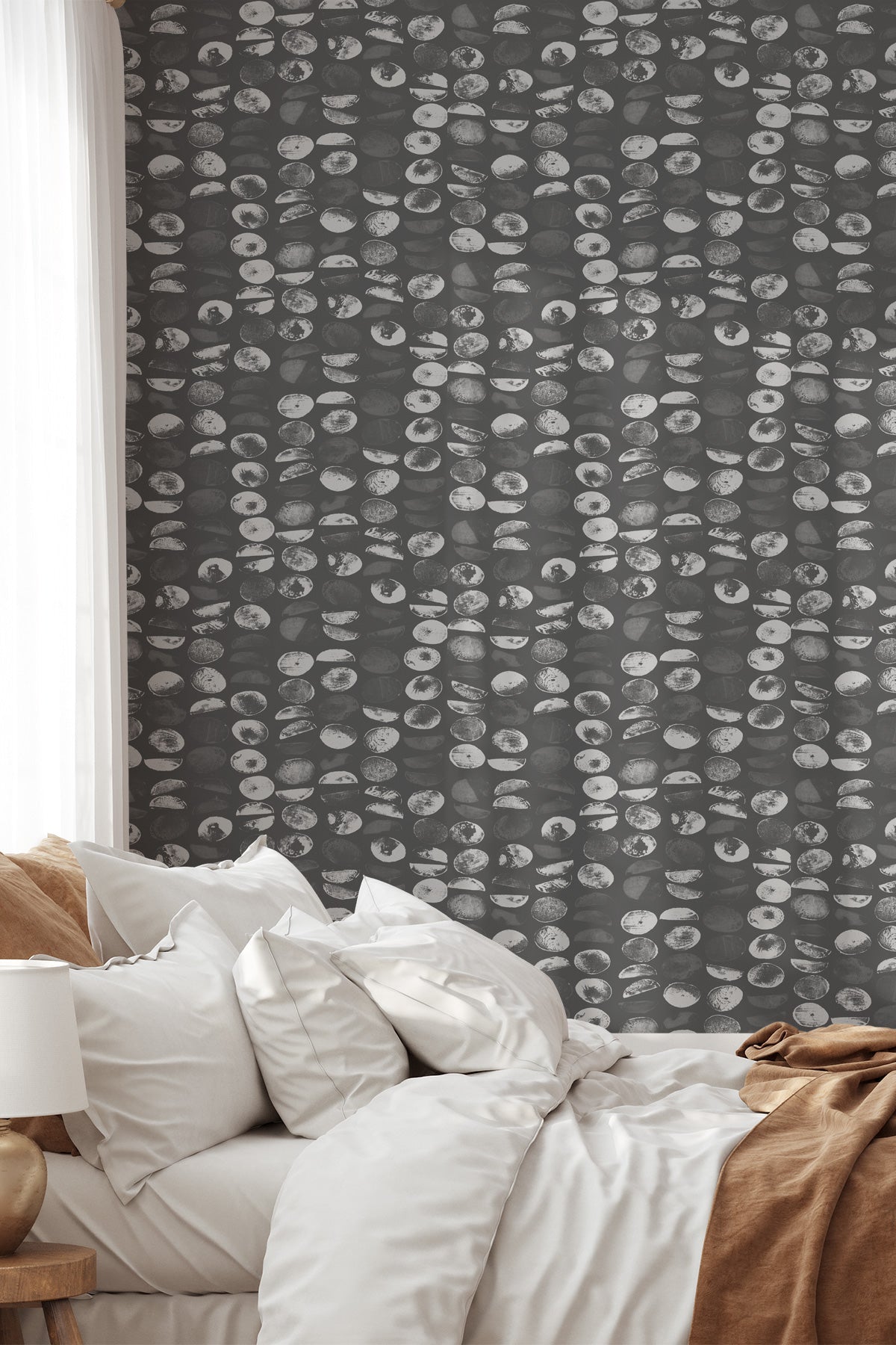 This is "Koichi Dark" a mesmerizing wallpaper featuring one of our most cherished patterns: abstract hand-stamped pebbles in a luxurious, dark hue. This design envelops your space in an aura of depth and refined artistic sophistication, making it ideal for a contemporary living room, a chic bedroom, or a stylish office. Each hand-stamped pebble, with its unique texture and organic form, creates a rich and dynamic visual tapestry, transforming your walls into a captivating canvas of modern elegance.