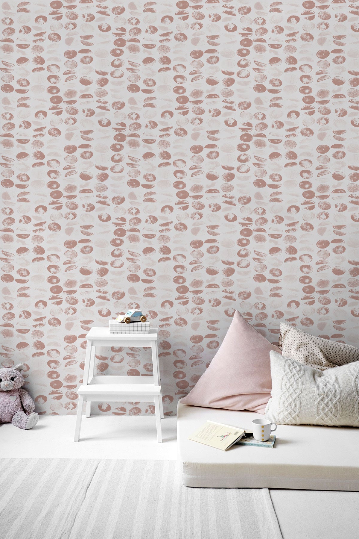 Koichi Light" is a captivating wallpaper that features our cherished pattern of abstract hand-stamped pebbles in a refreshing, light hue. This design illuminates your space with an airy elegance and artistic finesse, making it perfect for a serene living room, a tranquil bedroom, or a sophisticated office. Each hand-stamped pebble, with its unique texture and organic form, creates a delicate and dynamic visual landscape, transforming your walls into a luminous canvas of modern beauty.