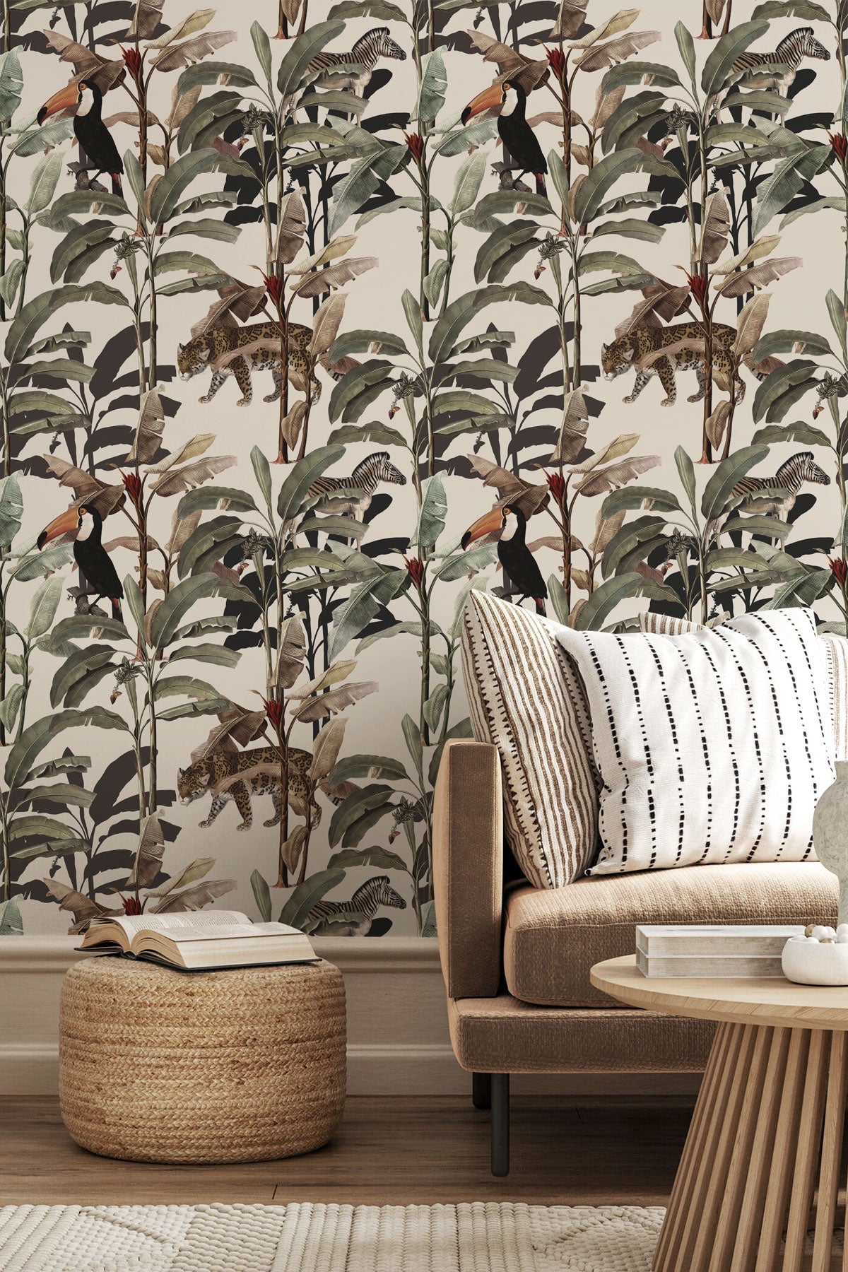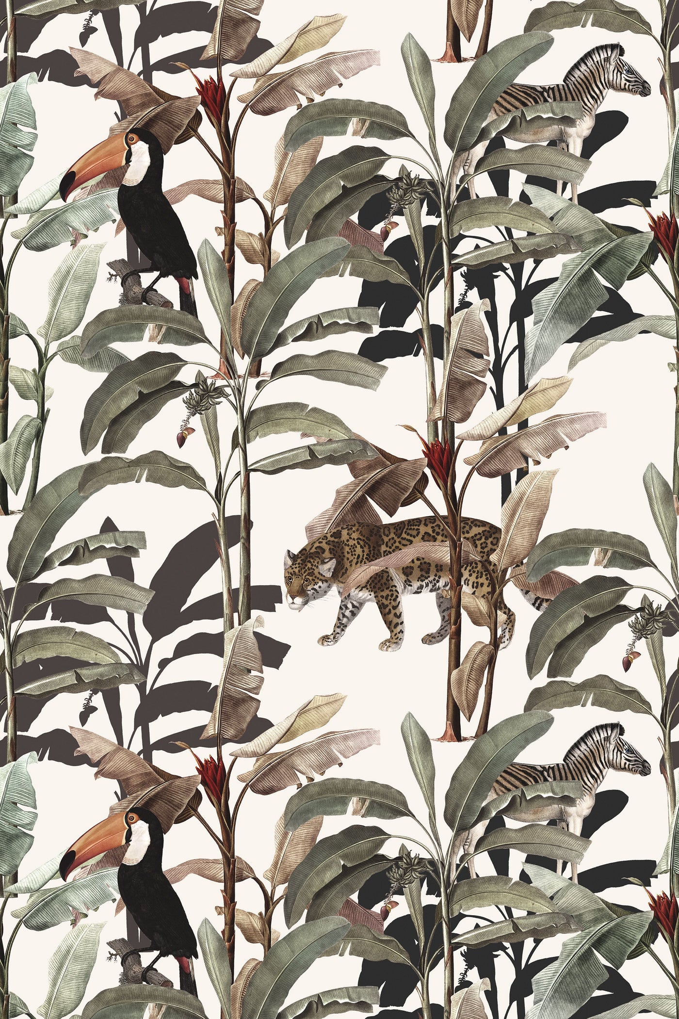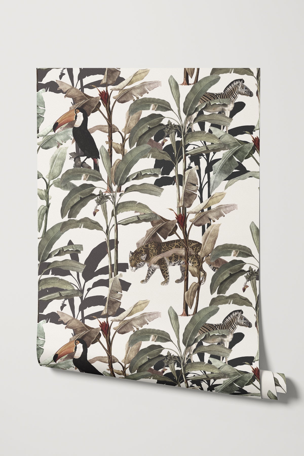 Blending jaguars, toucans, zebras, and banana trees, all artfully intertwined in a vintage hand-drawn style, our Lulonga wallpaper is a nostalgic journey into a bygone era where the wild and the exotic come to life in every stroke. It's a dance of jungle creatures and botanical wonders, reminiscent of classic illustrations. The vintage hand-drawn aesthetic adds a touch of warmth and character, creating a wallpaper that feels like a cherished storybook illustration. Let your walls tell a tale of timeless enchantment with this unique and captivating wallpaper.