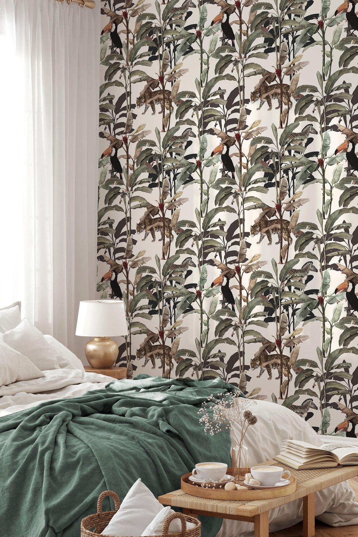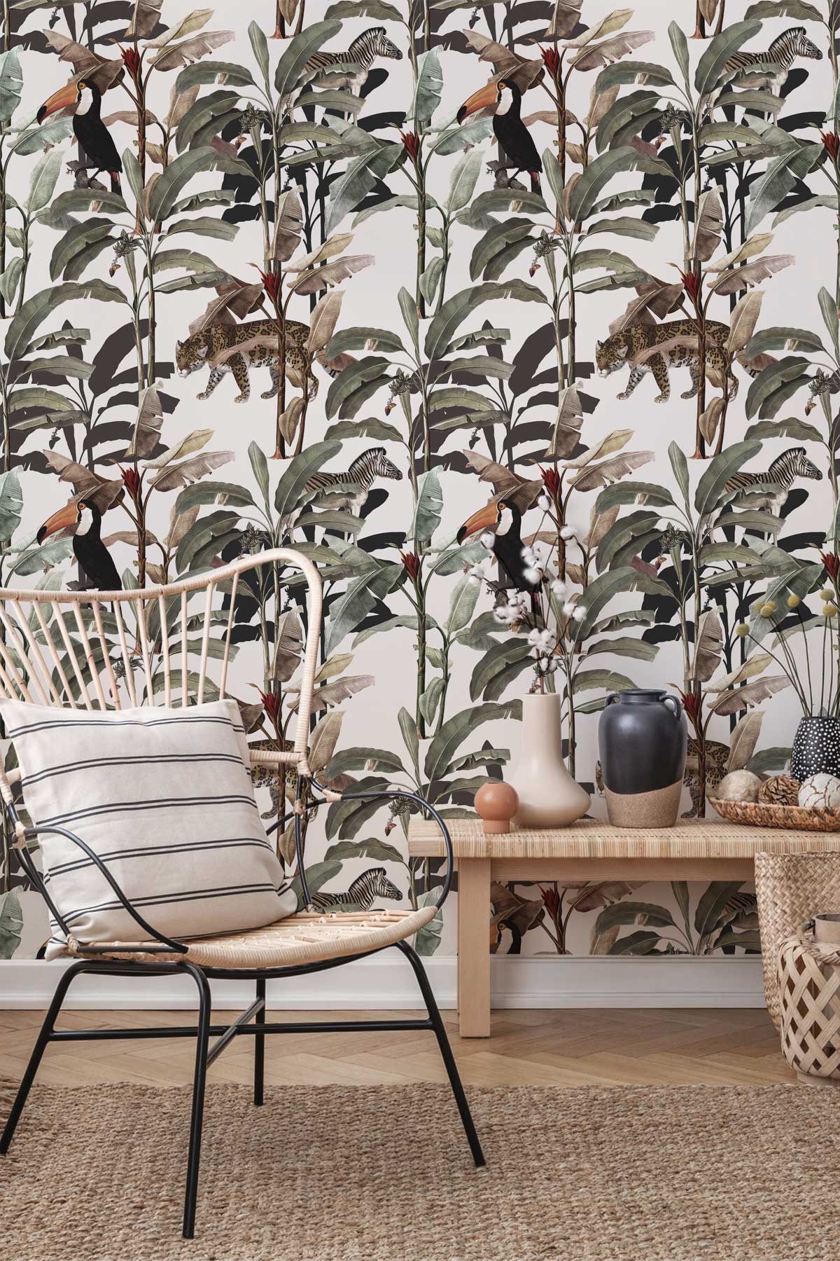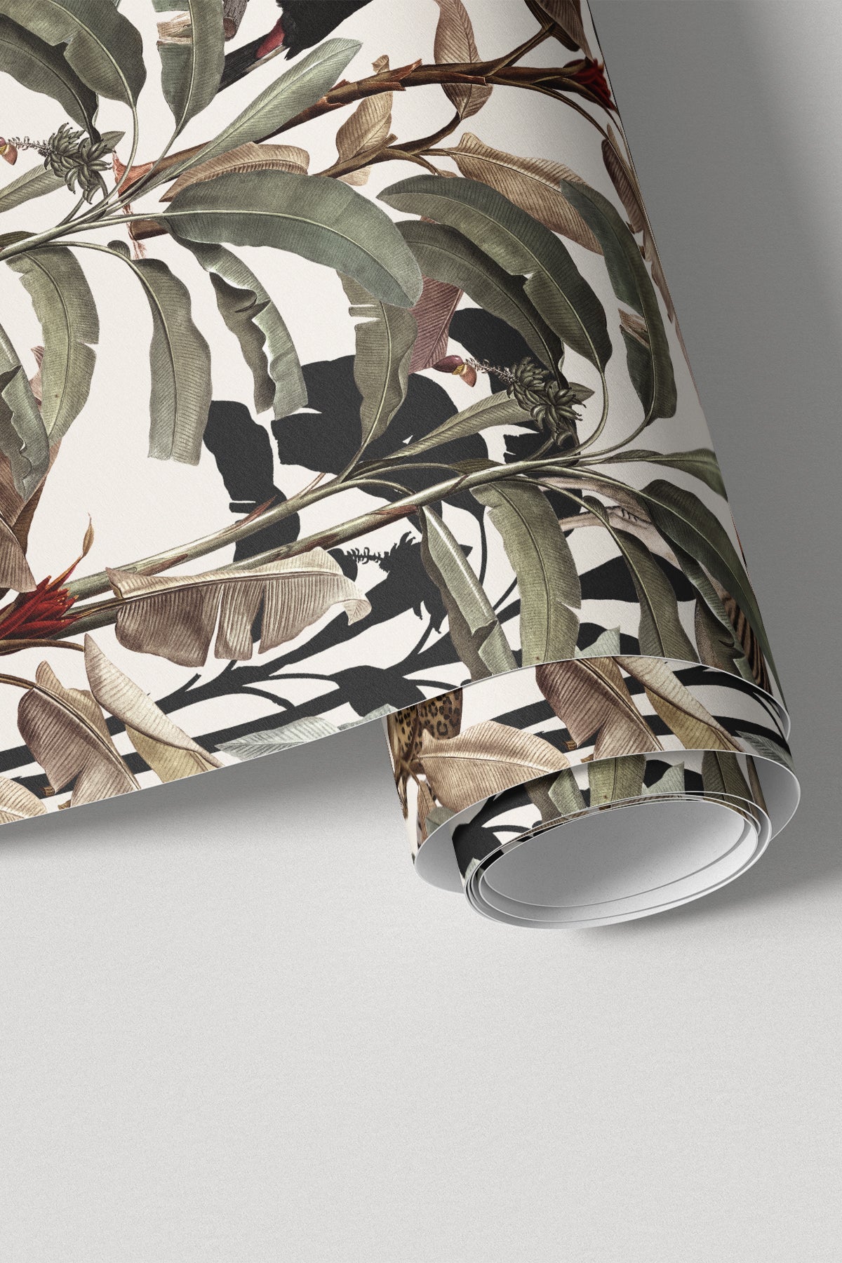 Blending jaguars, toucans, zebras, and banana trees, all artfully intertwined in a vintage hand-drawn style, our Lulonga wallpaper is a nostalgic journey into a bygone era where the wild and the exotic come to life in every stroke. It's a dance of jungle creatures and botanical wonders, reminiscent of classic illustrations. The vintage hand-drawn aesthetic adds a touch of warmth and character, creating a wallpaper that feels like a cherished storybook illustration. Let your walls tell a tale of timeless enchantment with this unique and captivating wallpaper.