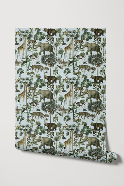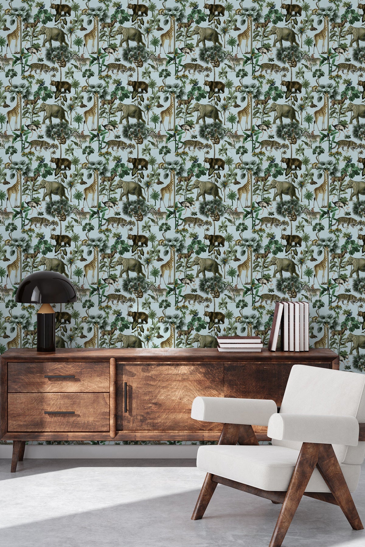 Step into the enchanting menagerie of our Lush Fauna Wallpaper – a vintage hand-drawn wallpaper featuring an array of charismatic animals, including bears, giraffes, zebras, elephants, and a lush assortment of tropical plants. It echoes a nostalgic journey into a whimsical wilderness where each creature and botanical element is a character in a timeless story. The hand-drawn aesthetic adds a touch of old-world charm, creating a wallpaper that invites you to explore the intricate details of this elegant and harmonious natural haven.