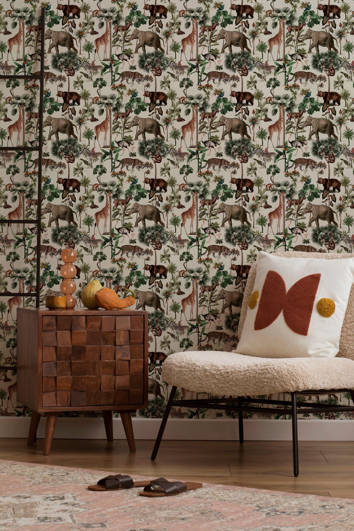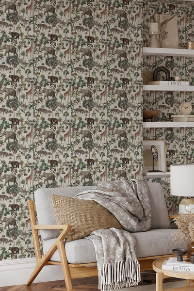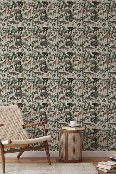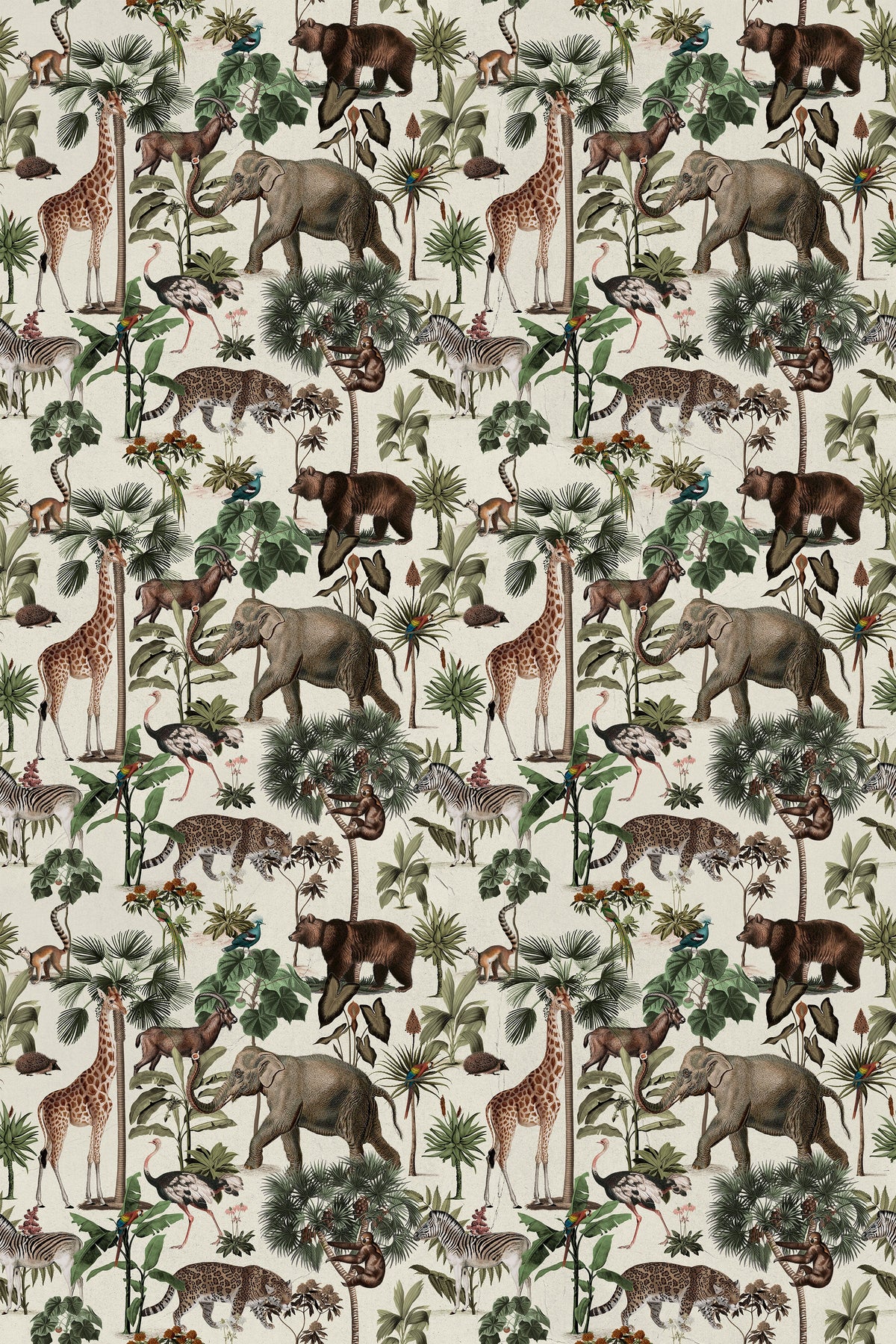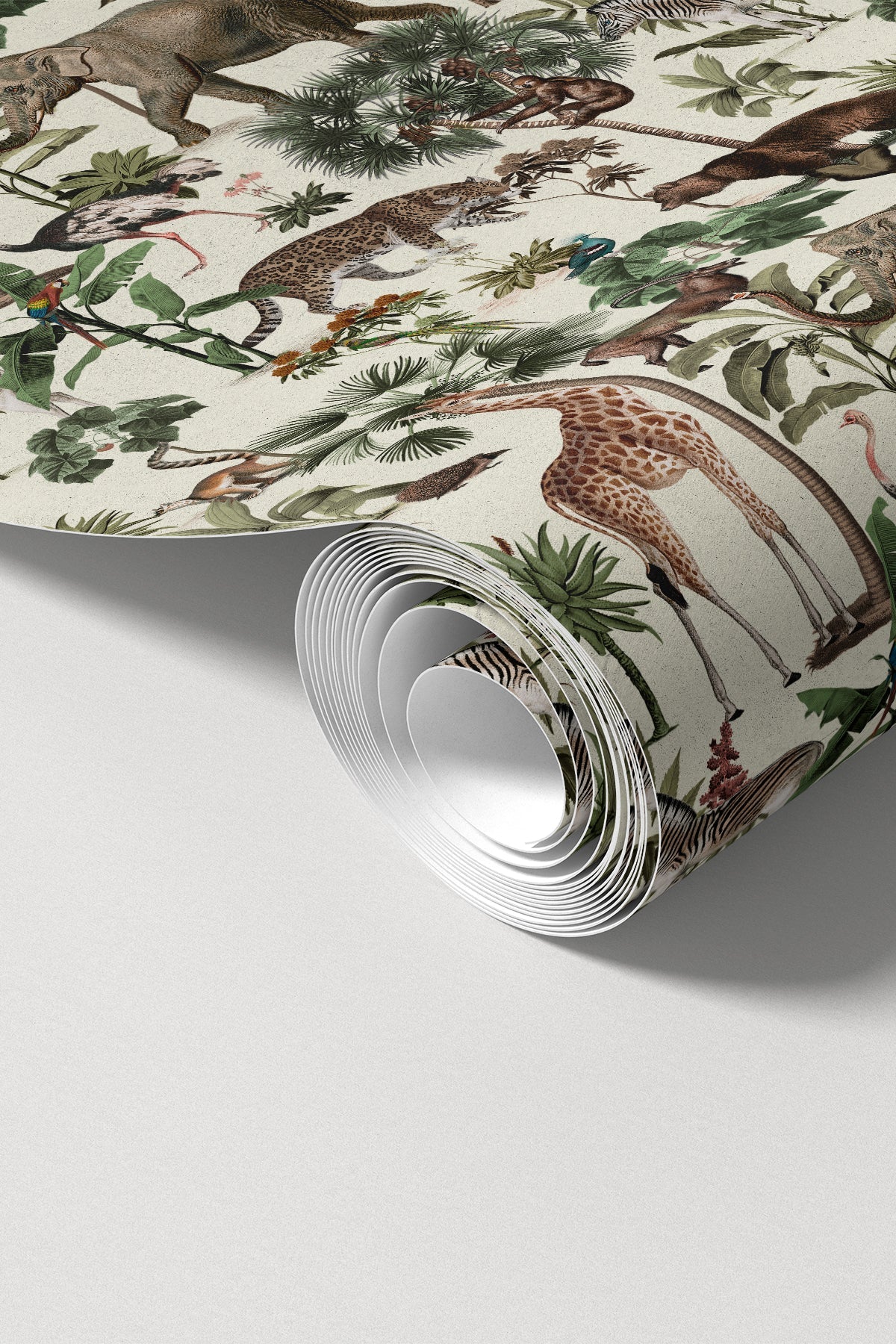 Step into the enchanting menagerie of our Lush Fauna Wallpaper – a vintage hand-drawn wallpaper featuring an array of charismatic animals, including bears, giraffes, zebras, elephants, and a lush assortment of tropical plants. It echoes a nostalgic journey into a whimsical wilderness where each creature and botanical element is a character in a timeless story. The hand-drawn aesthetic adds a touch of old-world charm, creating a wallpaper that invites you to explore the intricate details of this elegant and harmonious natural haven.