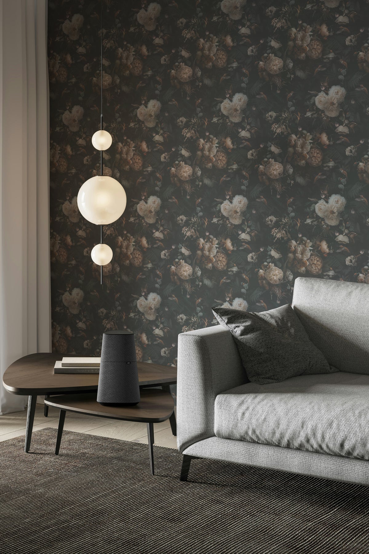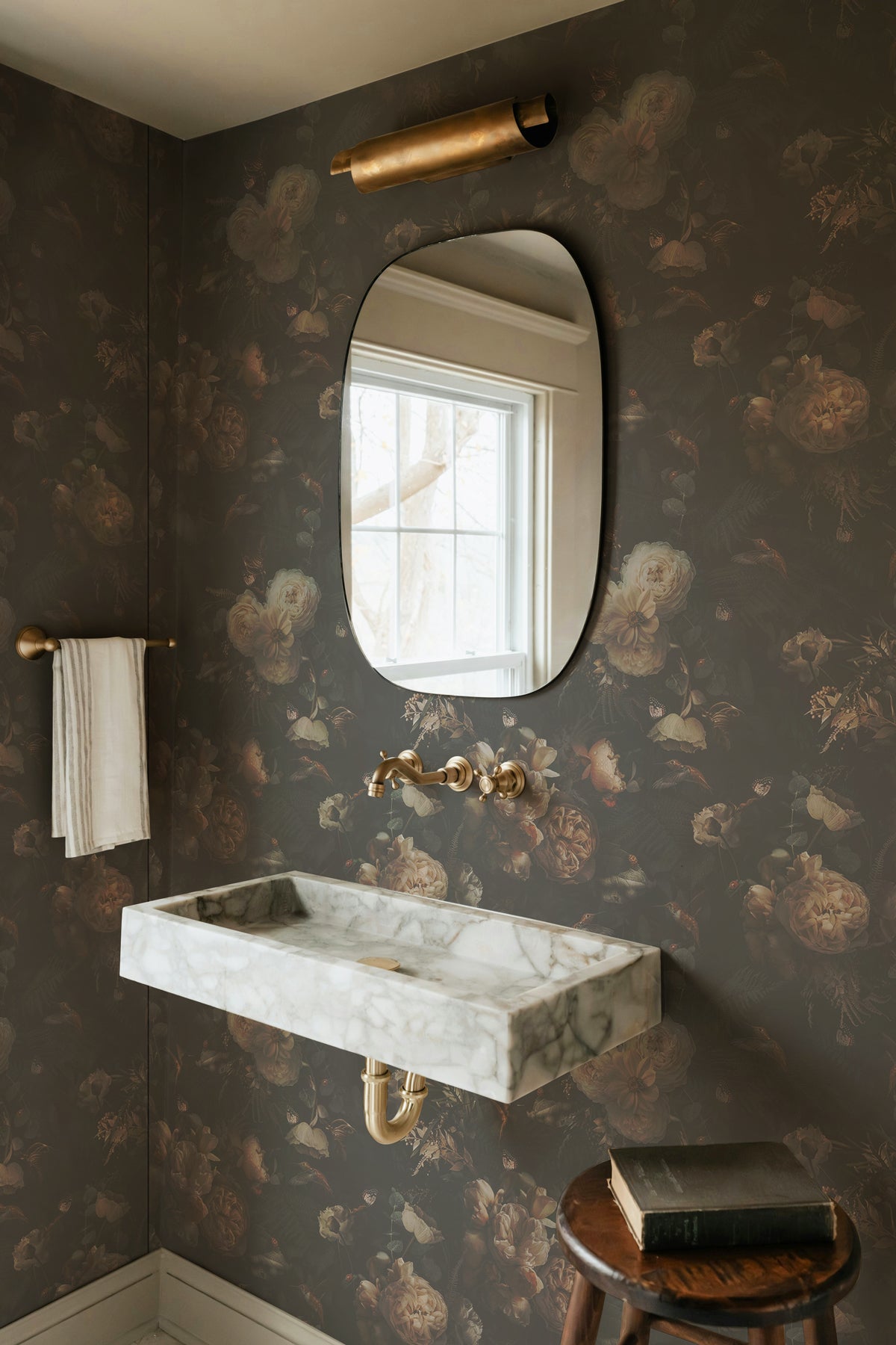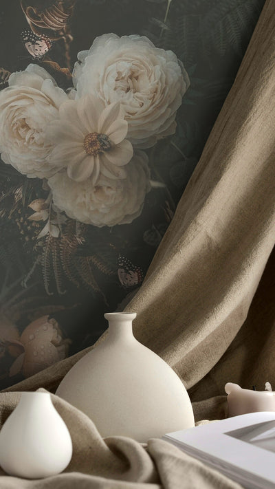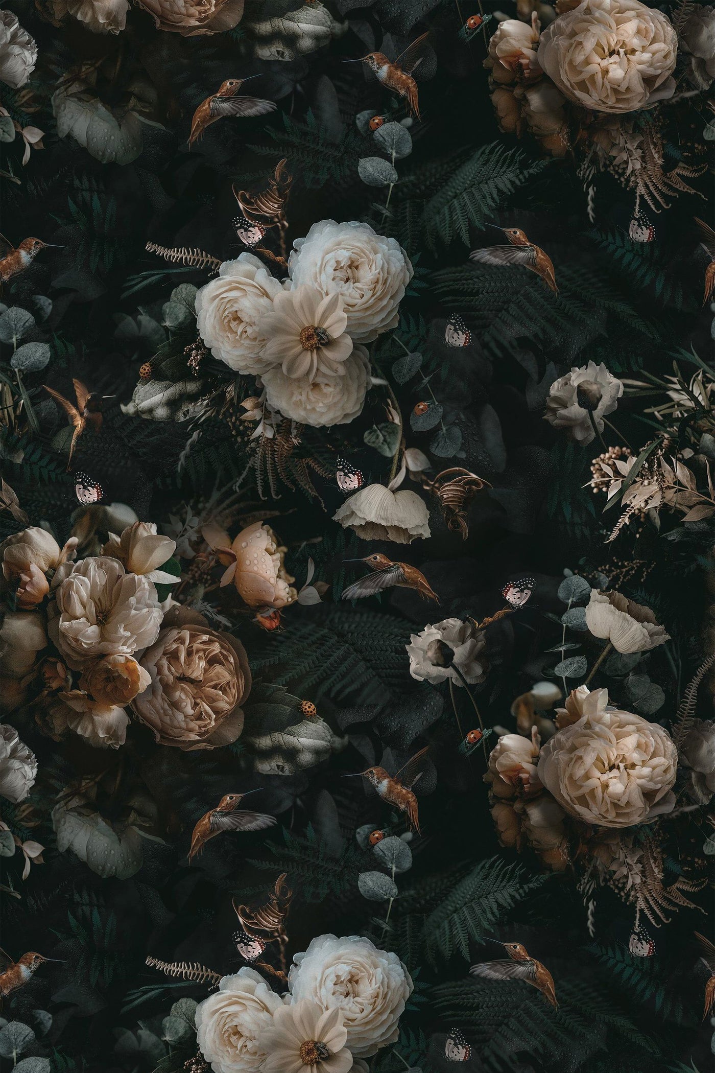 Transform your space with the dramatic elegance of our Midnight Nectar mural, a richly layered dark floral wallpaper featuring delicate hummingbirds in flight. This moody botanical design showcases creamy white roses, lush green foliage, and fluttering birds surrounded by subtle wildlife details like butterflies and ladybugs—perfectly balanced to evoke a sense of mystery, romance, and luxury.