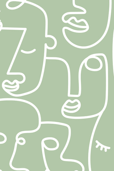 Refresh your interior with this minimalist abstract wallpaper, showcasing a continuous white line drawing of faces against a soft melon green background. The modern, artistic design offers a subtle yet captivating pattern, perfect for adding contemporary elegance to any room. Ideal for creating a fresh, natural feel with an artistic touch.