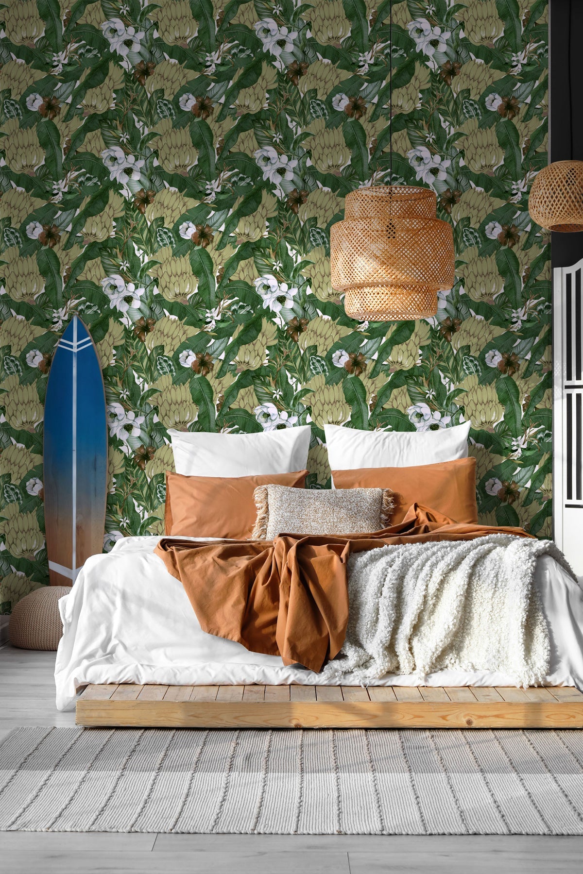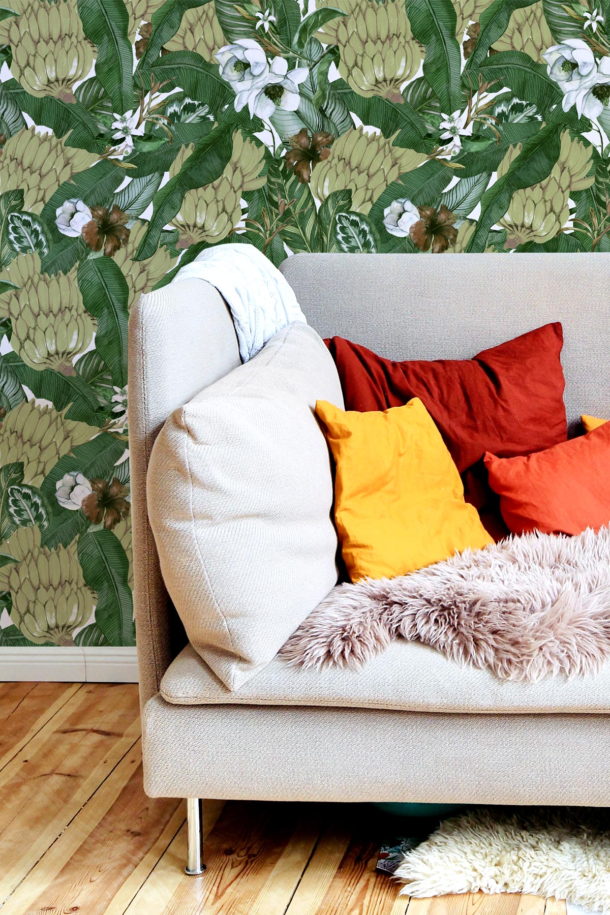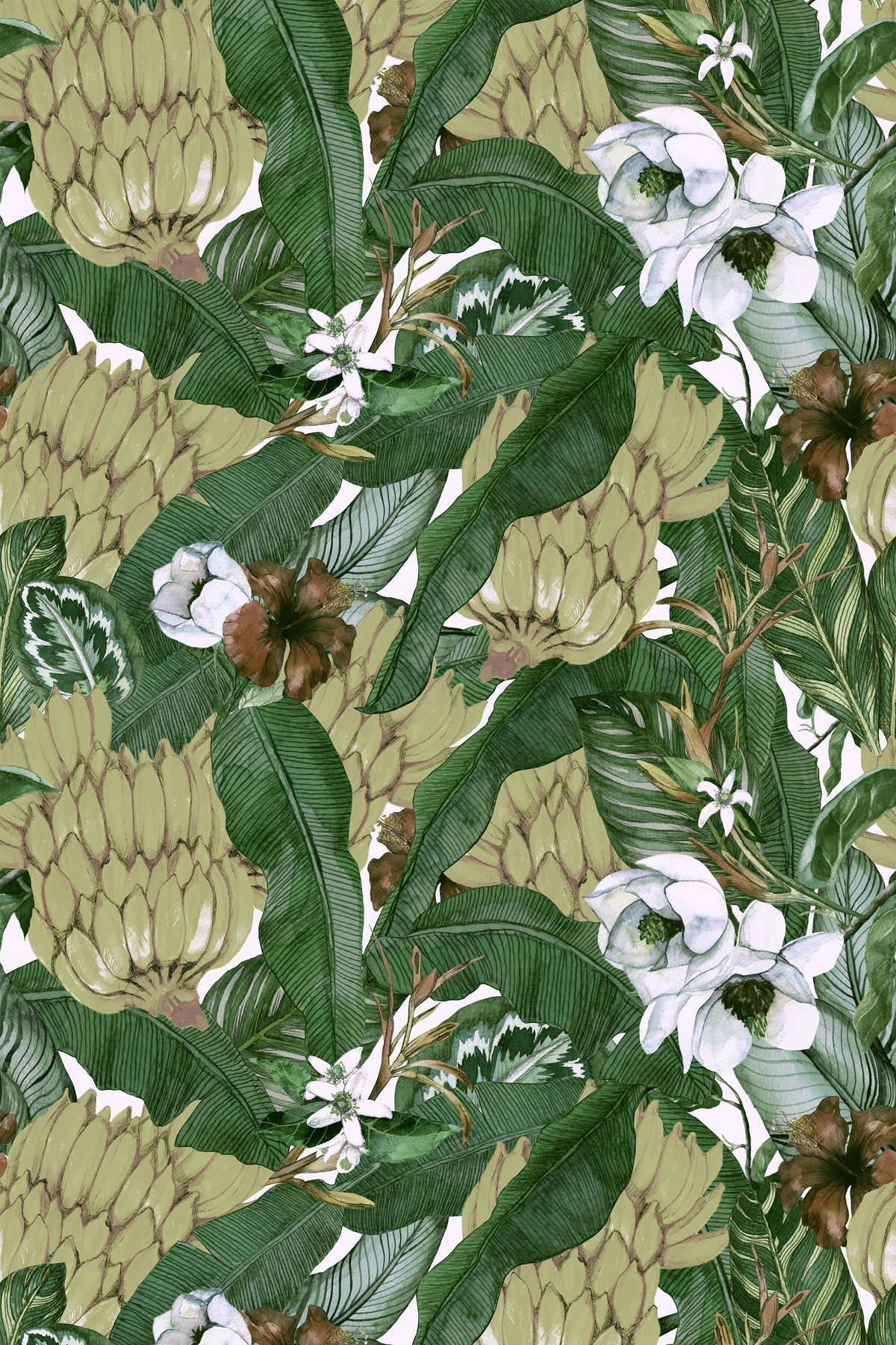 Bananas, banana leaves and tropical flowers are meticulously rendered in the fluid beauty of watercolor with our Musa Wallpaper. The Musa Wallpaper brings the vivacity of nature indoors, turning your room into a canvas of natural splendor. The playful dance of bananas and the graceful sprawl of leaves are artfully intertwined, creating a pattern that is both dynamic and soothing.