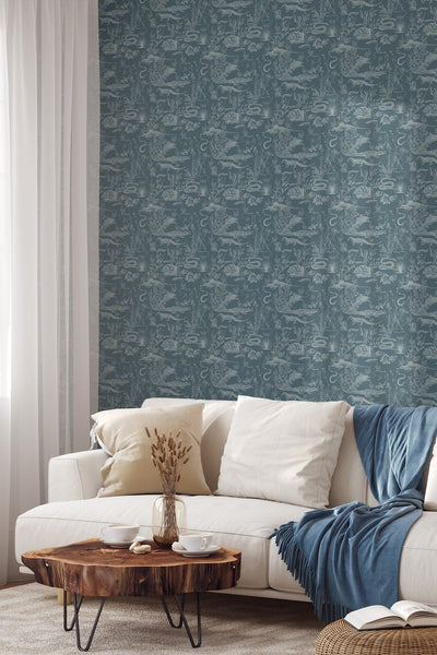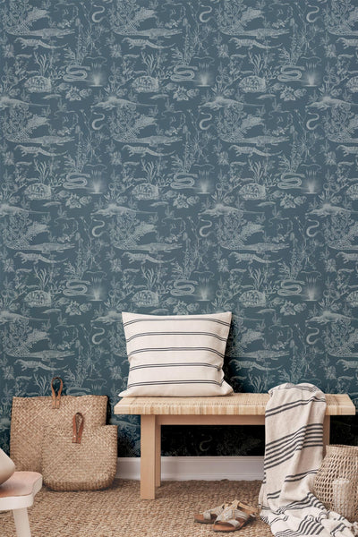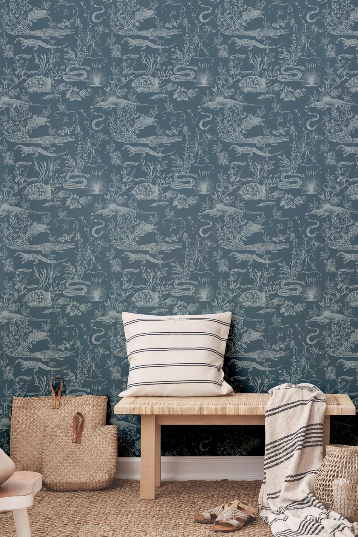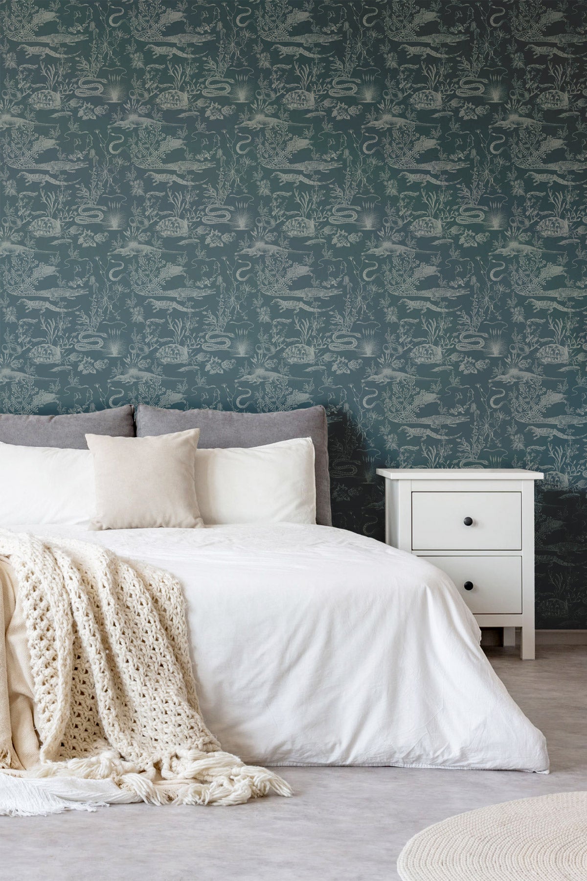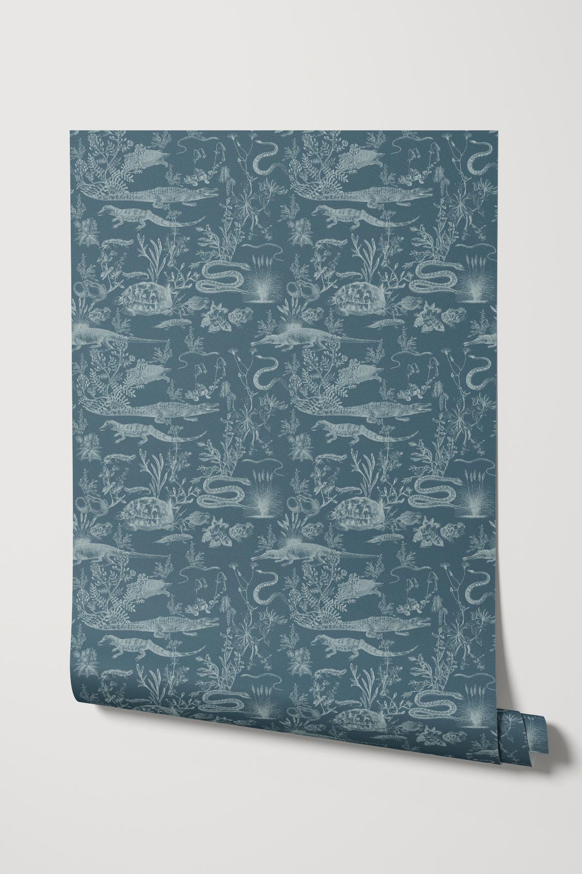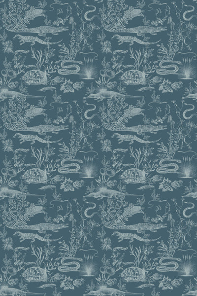 "New Orleans Dark" is a striking wallpaper inspired by the mystique of the Louisiana swamps. This toile-style pattern features hand-drawn alligators, snakes, and turtles set against a deep, dark background, evoking the haunting beauty and richness of the bayou. Each creature appears nestled among tangled flora, bringing a sense of adventure and wild charm to your walls. Perfect for those drawn to bold, atmospheric designs, "New Orleans Dark" adds a touch of Southern mystery and depth to any space.