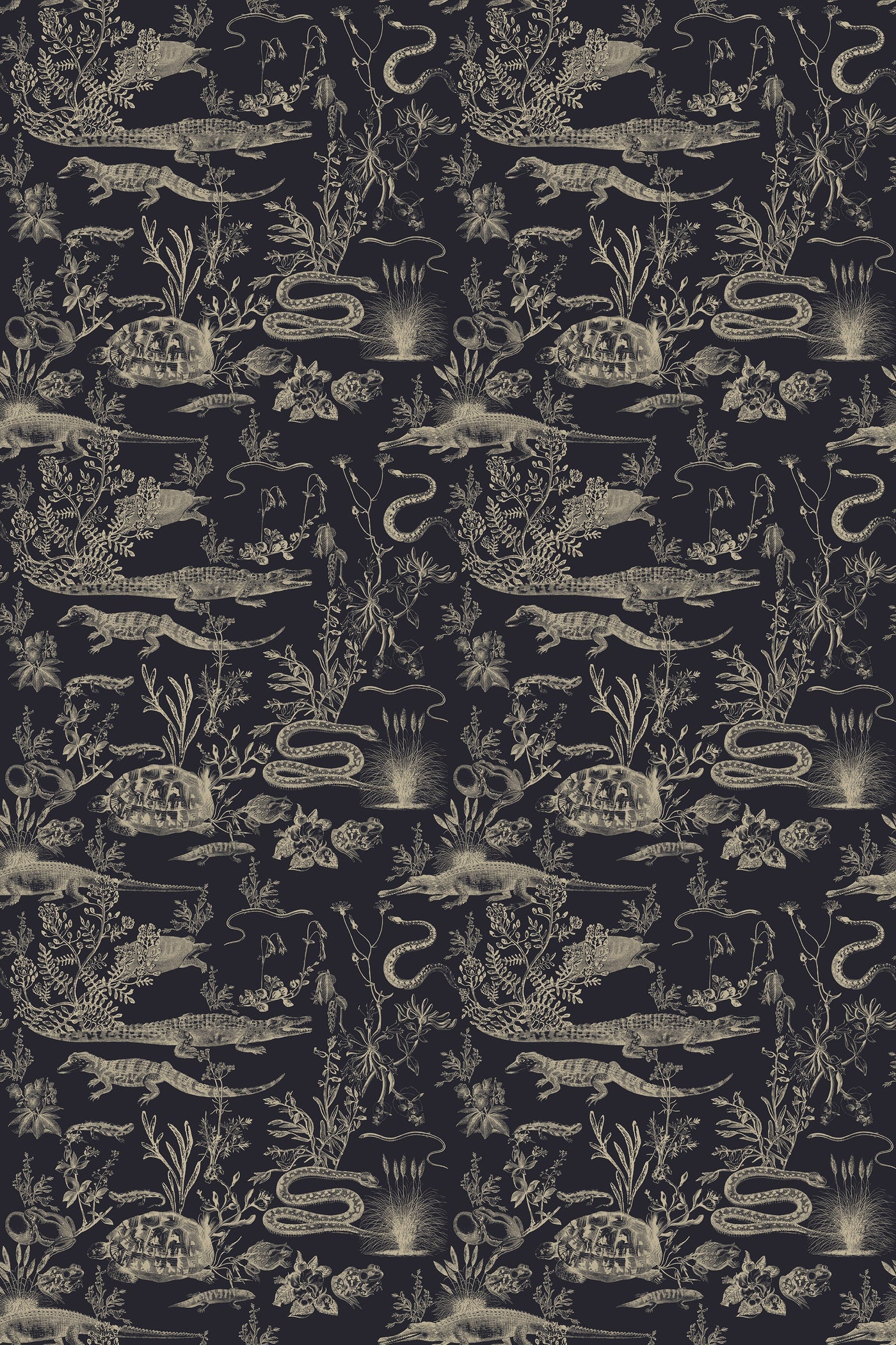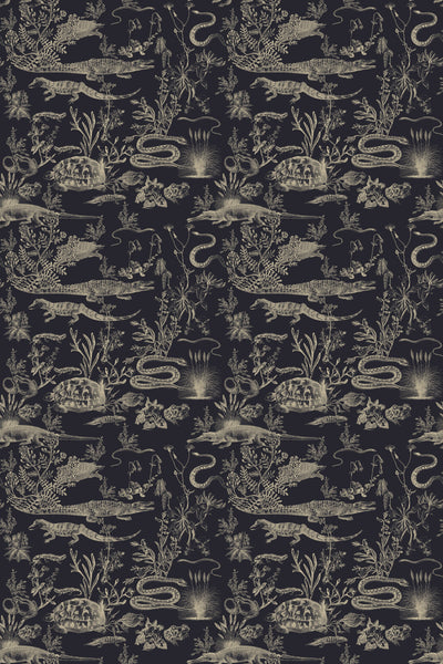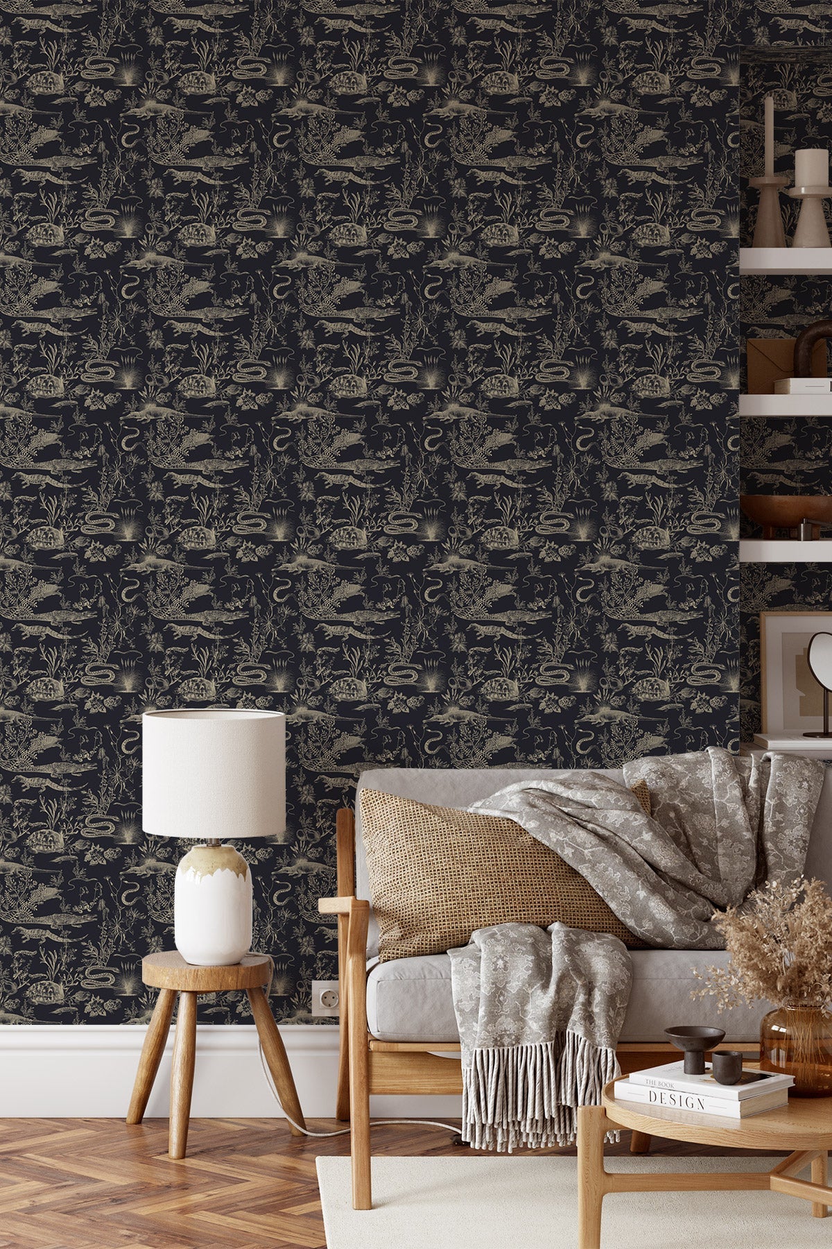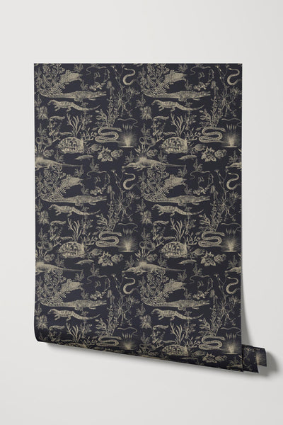 "New Orleans Dark" is a striking wallpaper inspired by the mystique of the Louisiana swamps. This toile-style pattern features hand-drawn alligators, snakes, and turtles set against a deep, dark background, evoking the haunting beauty and richness of the bayou. Each creature appears nestled among tangled flora, bringing a sense of adventure and wild charm to your walls. Perfect for those drawn to bold, atmospheric designs, "New Orleans Dark" adds a touch of Southern mystery and depth to any space.
