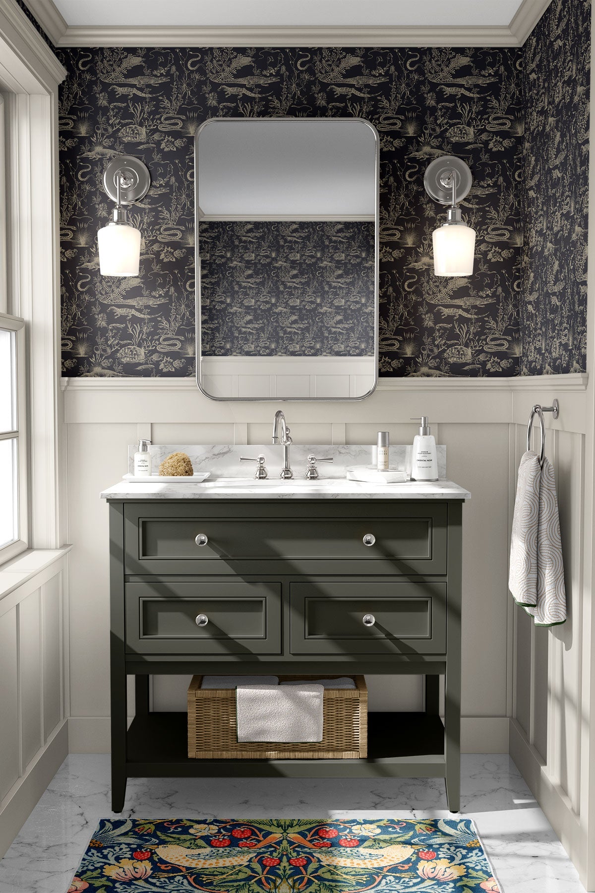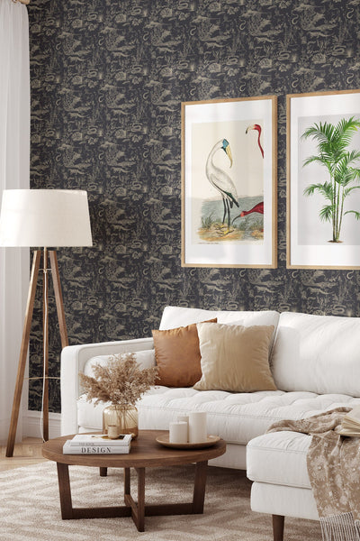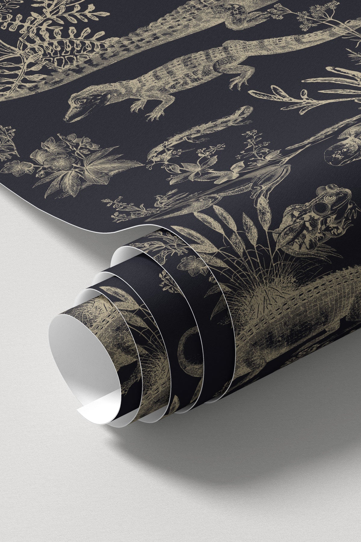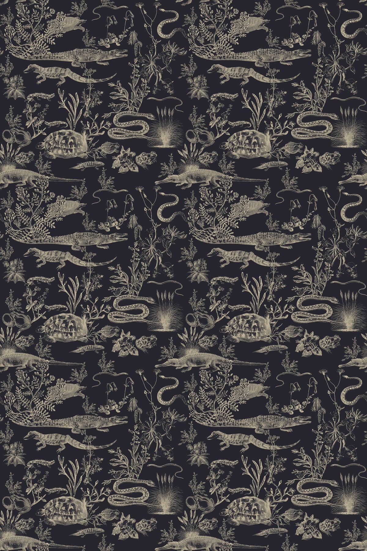 "New Orleans Dark" is a striking wallpaper inspired by the mystique of the Louisiana swamps. This toile-style pattern features hand-drawn alligators, snakes, and turtles set against a deep, dark background, evoking the haunting beauty and richness of the bayou. Each creature appears nestled among tangled flora, bringing a sense of adventure and wild charm to your walls. Perfect for those drawn to bold, atmospheric designs, "New Orleans Dark" adds a touch of Southern mystery and depth to any space.