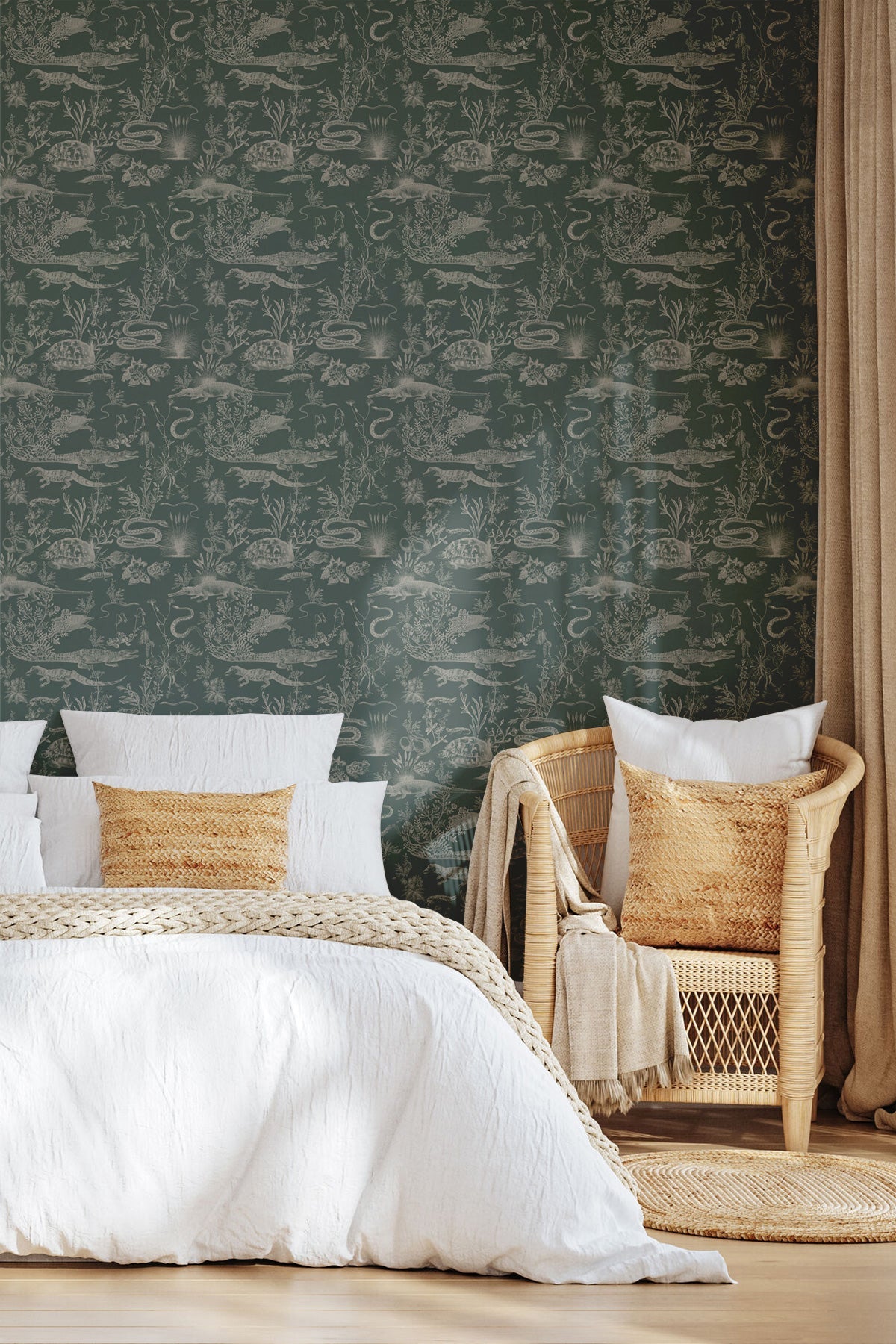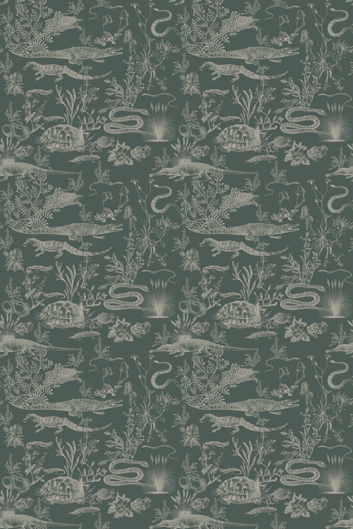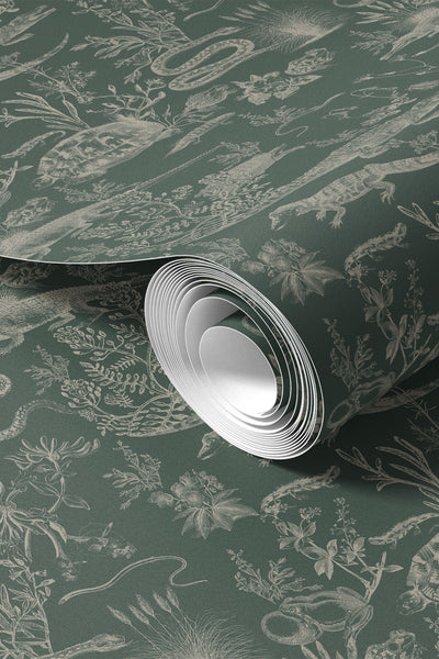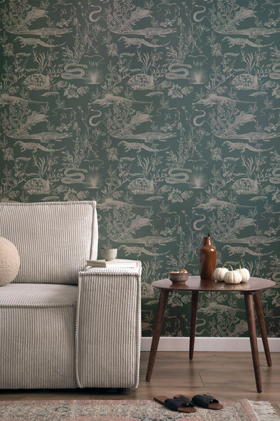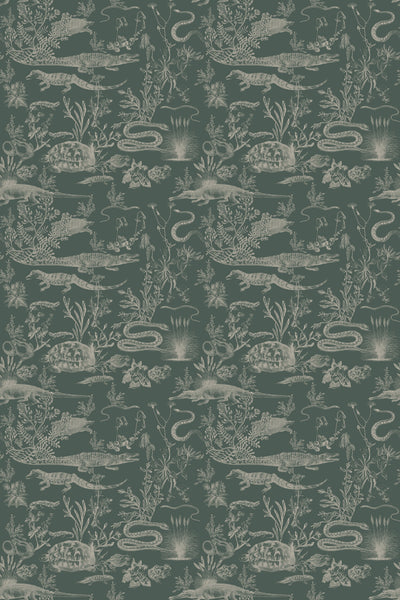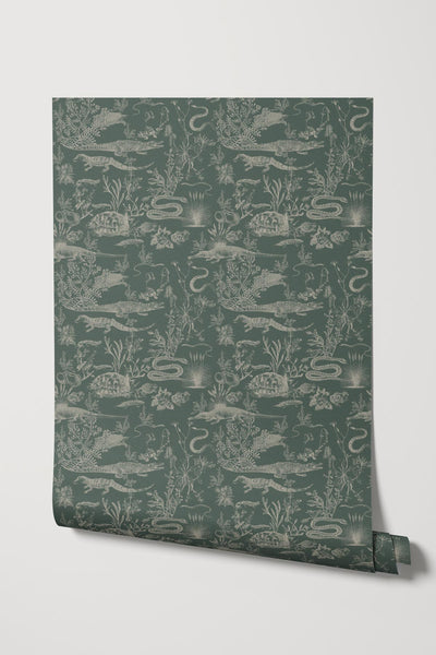 "New Orleans Dark" is a striking wallpaper inspired by the mystique of the Louisiana swamps. This toile-style pattern features hand-drawn alligators, snakes, and turtles set against a deep, dark background, evoking the haunting beauty and richness of the bayou. Each creature appears nestled among tangled flora, bringing a sense of adventure and wild charm to your walls. Perfect for those drawn to bold, atmospheric designs, "New Orleans Dark" adds a touch of Southern mystery and depth to any space.