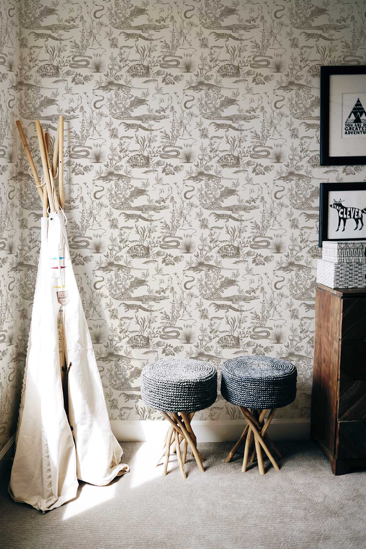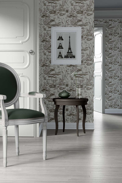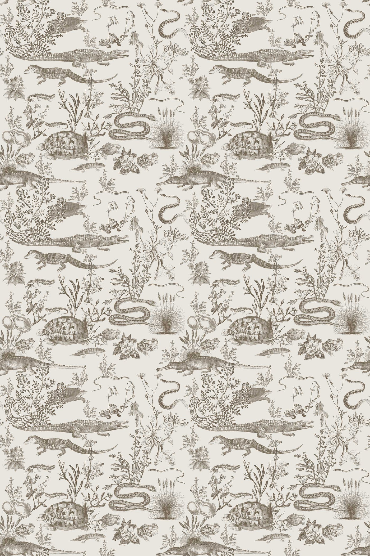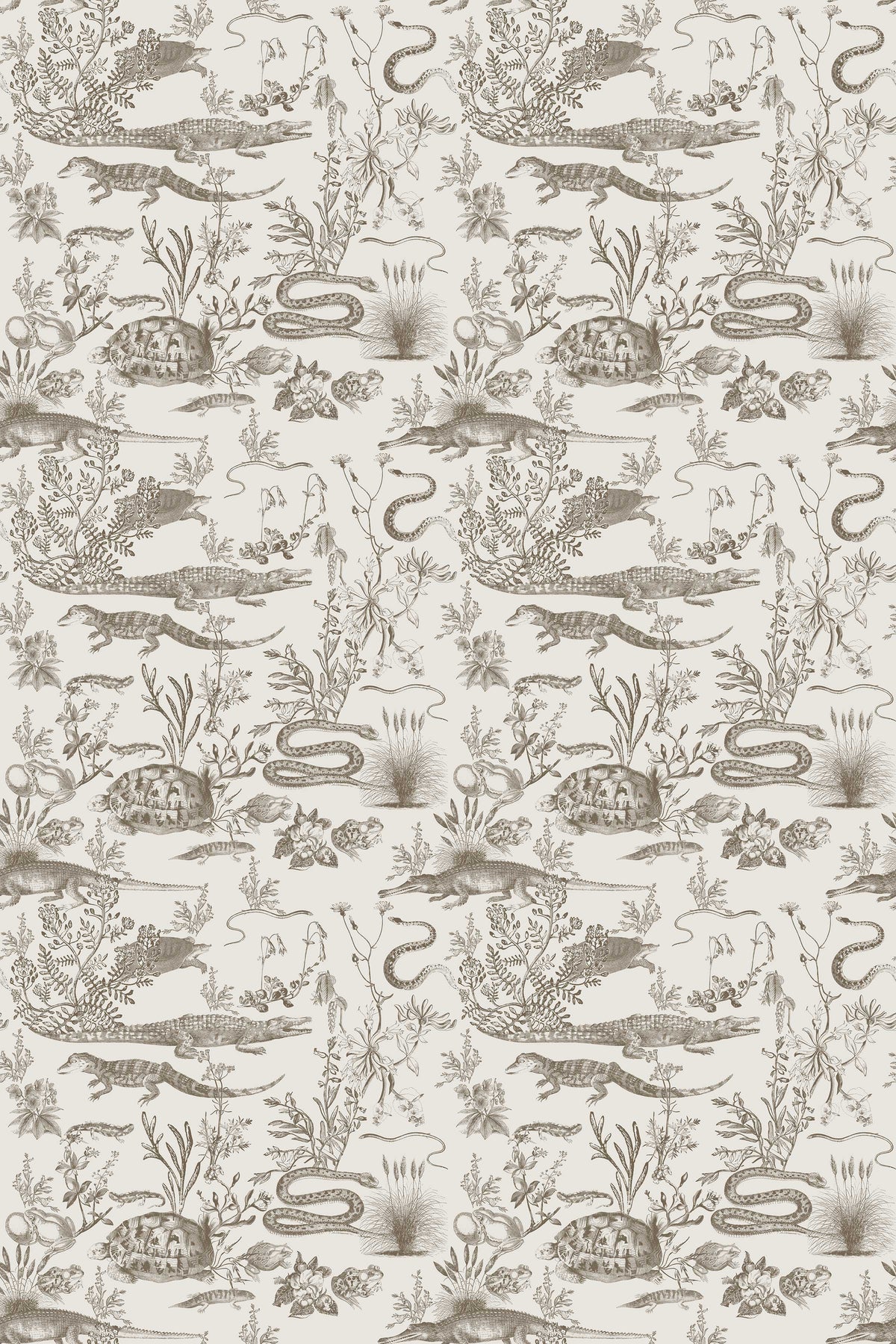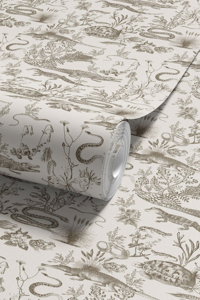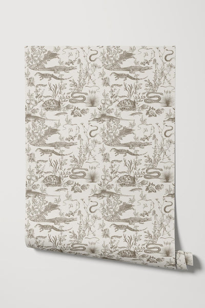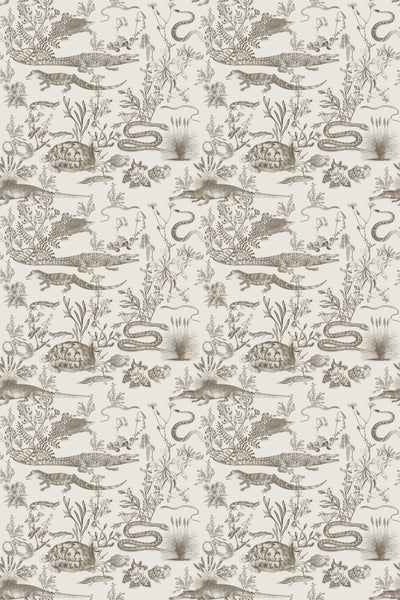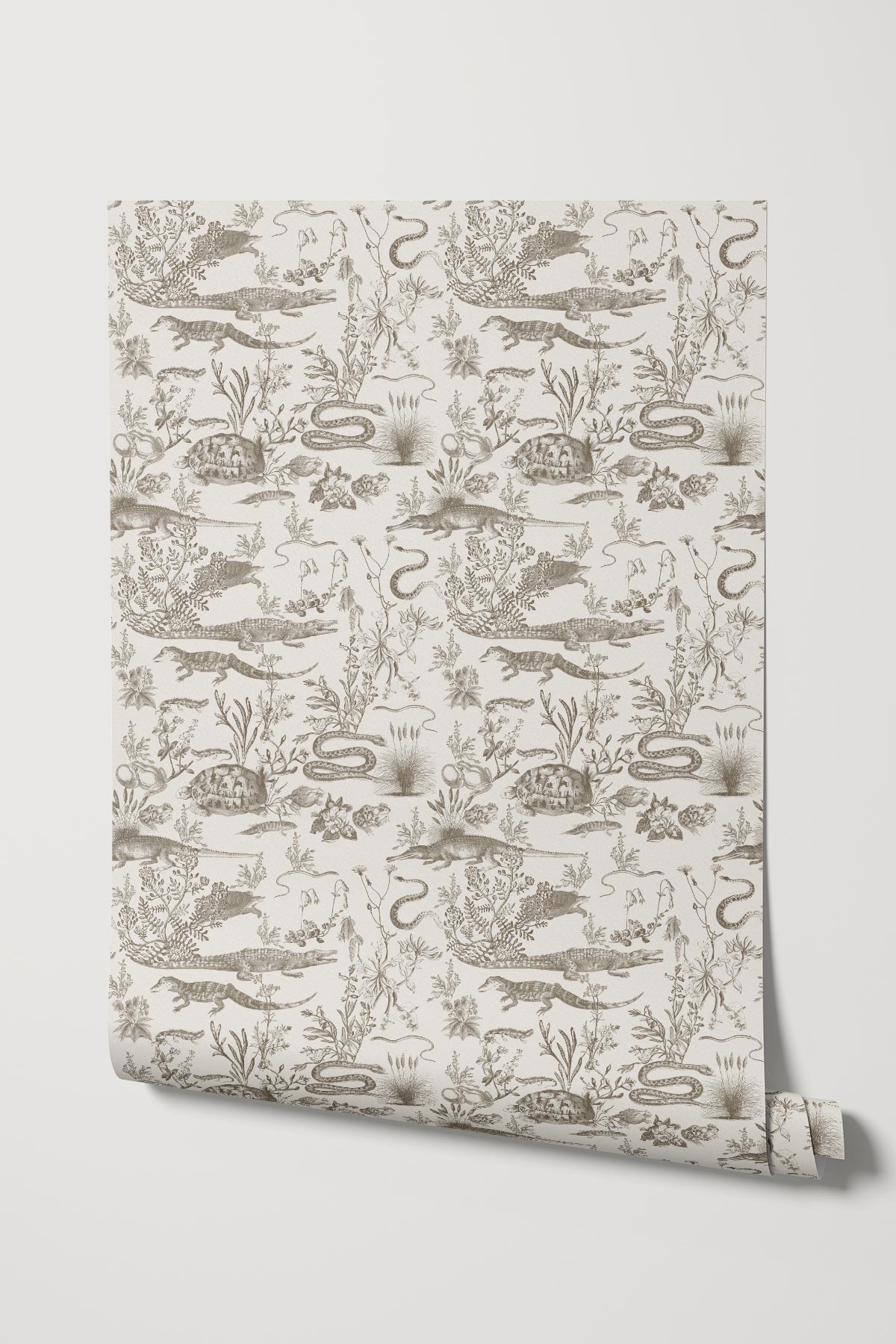 "New Orleans Light" is a captivating wallpaper that brings the intrigue of Louisiana swamps into a fresh, airy setting. This toile-style pattern, set against a light background, features hand-drawn alligators, snakes, and turtles nestled among lush flora, capturing the essence of bayou life with a soft, inviting touch. The lighter backdrop lends an elegant warmth to the scene, balancing mystery with brightness. "New Orleans Light" brings a blend of Southern charm and natural wonder to your space, perfect for those who love a hint of wild beauty in a refined design.