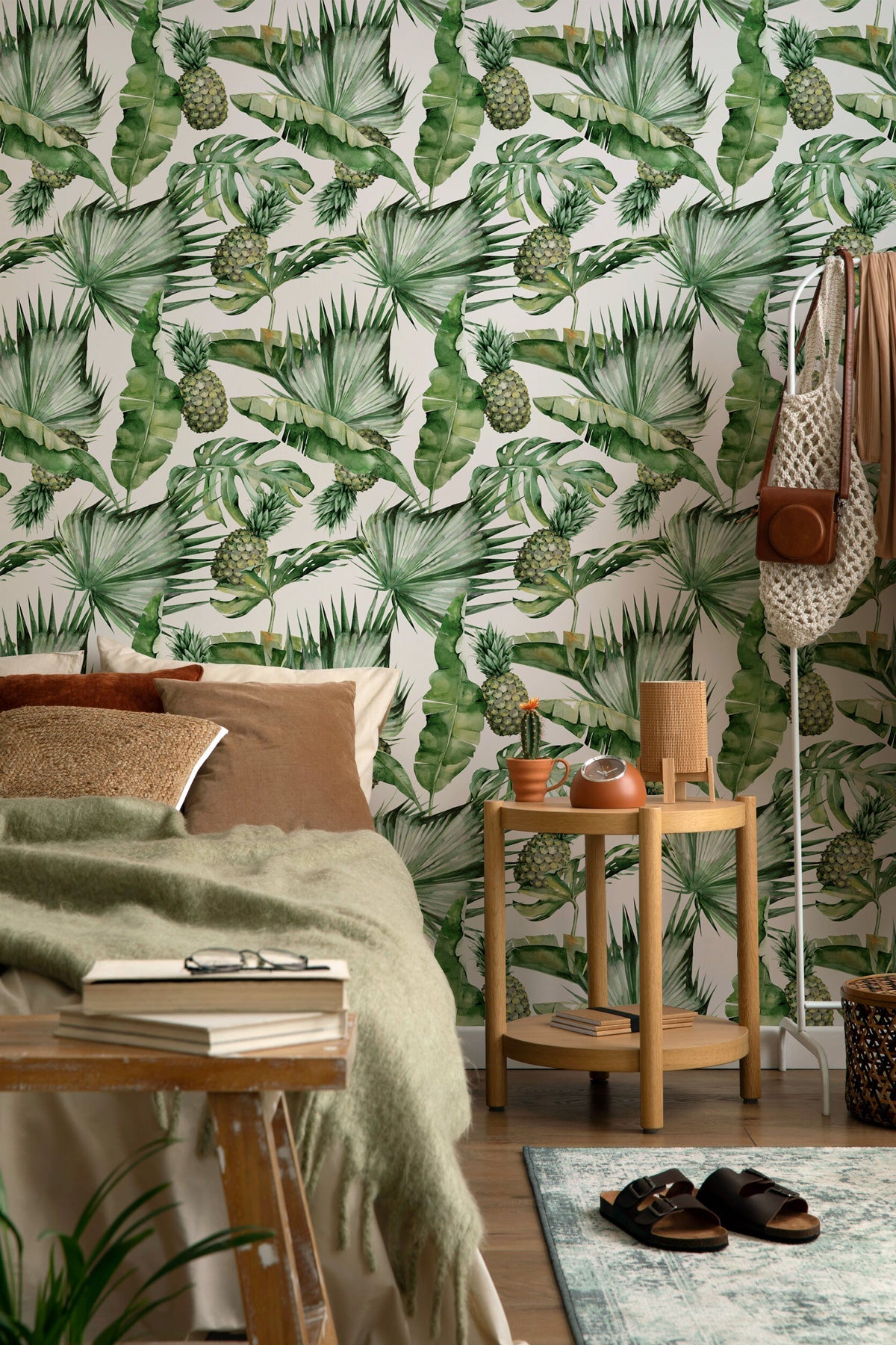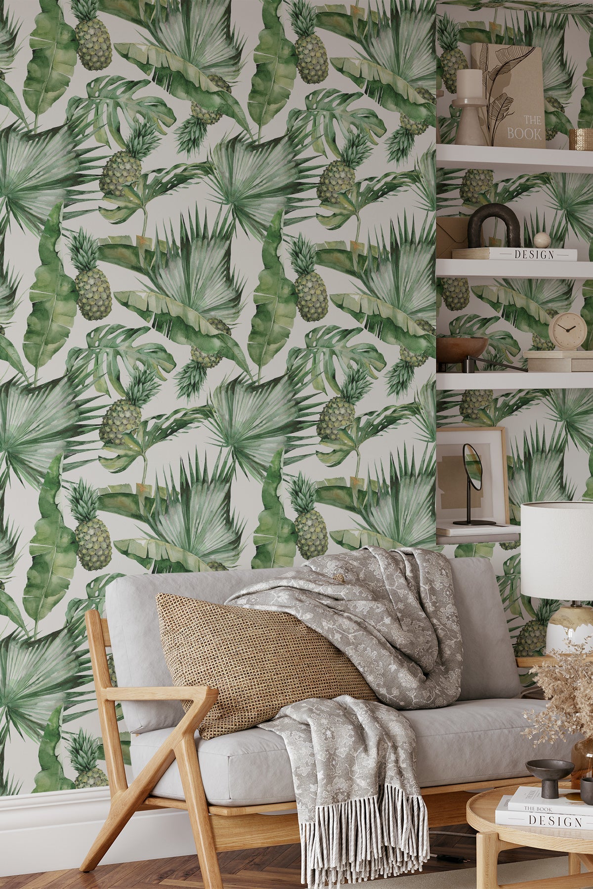 Our Pineapple Punch Watercolor Wallpaper is an electrifying fusion of tropical vibrancy that transports the exotic charm of pineapples and large palm leaves directly onto your walls. This wallpaper is lively, energetic and captivating. The playful mix of bold pineapples and the lush elegance of palm leaves creates a dynamic yet harmonious visual treat. The watercolor style adds a touch of artistic flair, ensuring that every glance reveals a new nuance of color and detail.