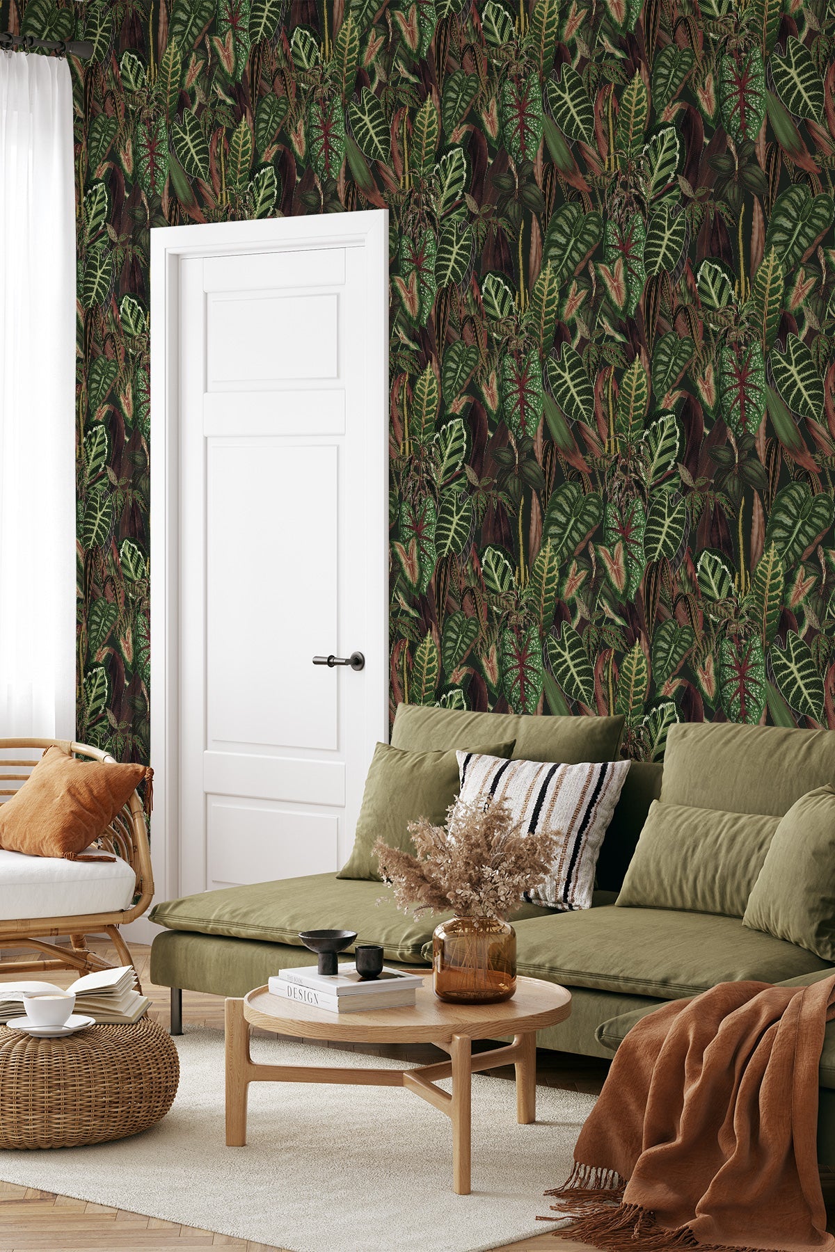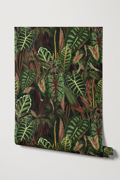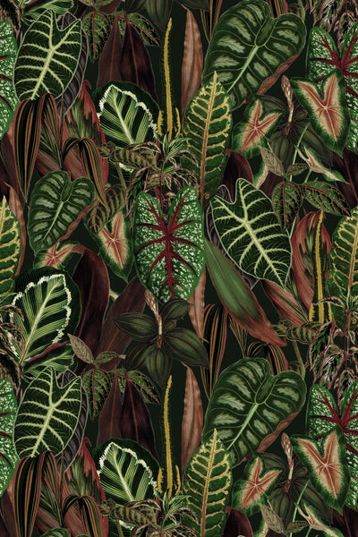 If you are seeking a lush and vibrant composition that breathes life into your space, then our Sumatra wallpaper was meant for you! With a luxuriant medley of croton plants, philodendron, alocasias, and more, this captivating wallpaper of tropical flora mirrors the untamed beauty of Sumatra's landscapes into your home. This isn't just wallpaper; it's a visual escape to the heart of a thriving rainforest.