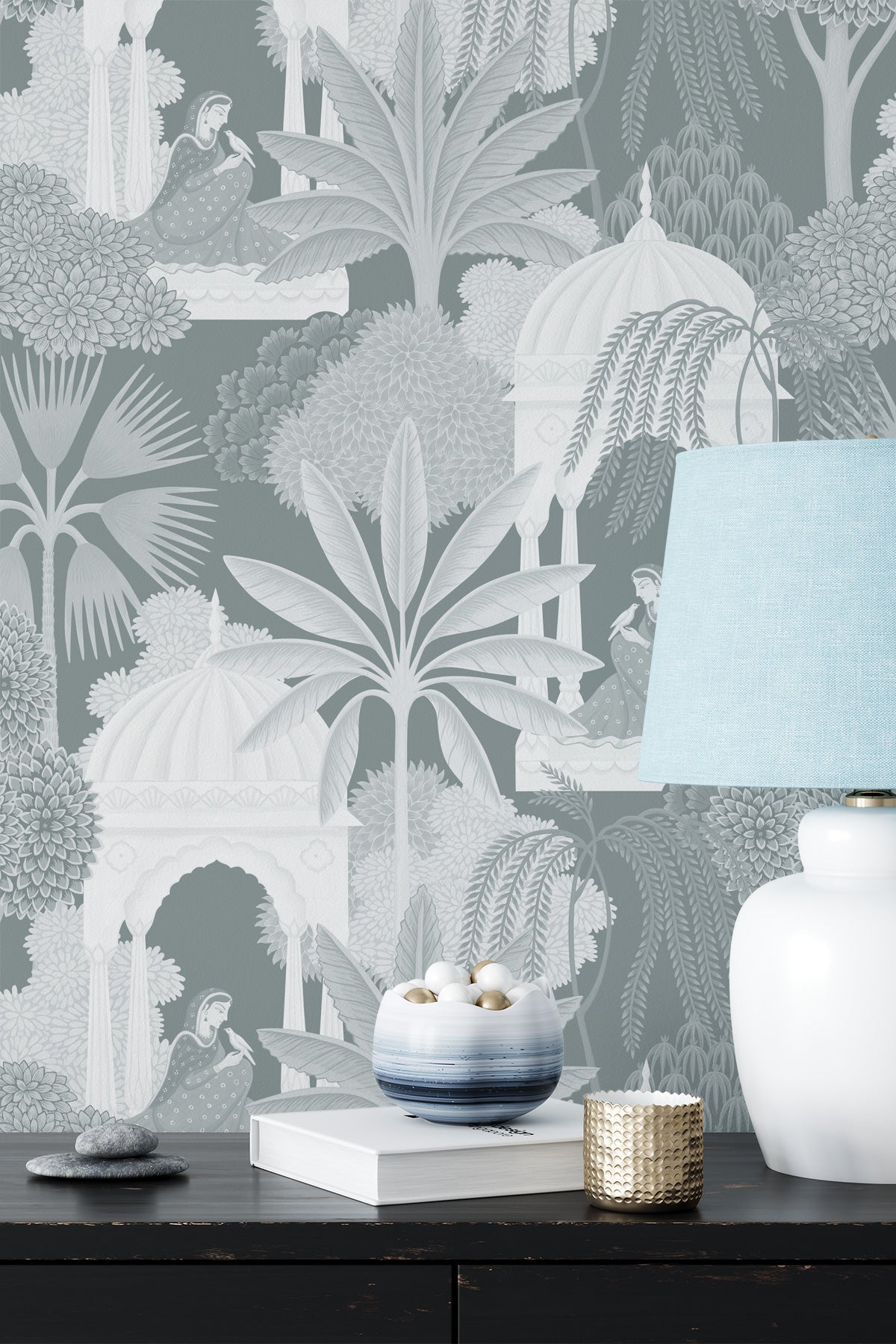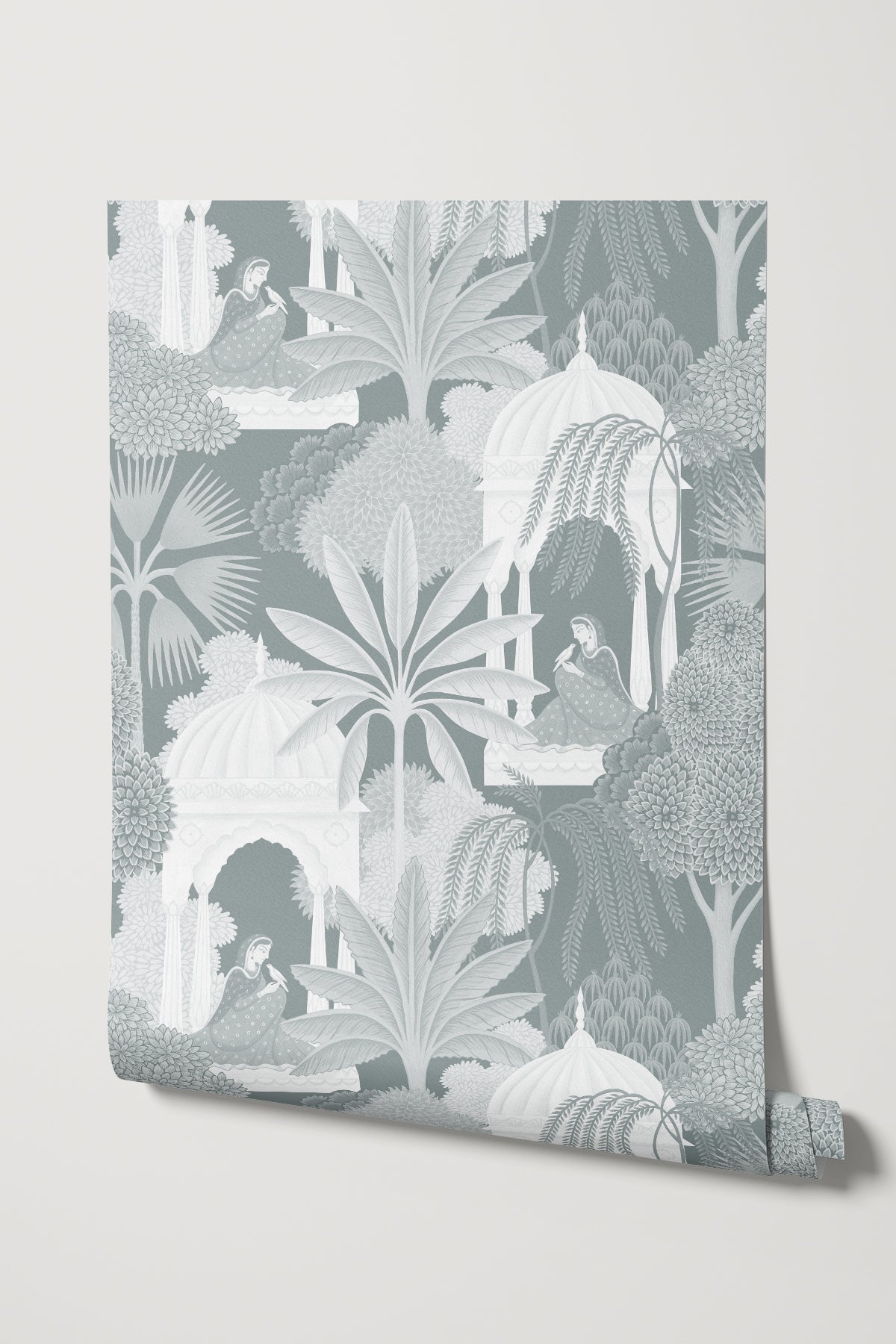 Our Uttar Pradesh Wallpaper is a mesmerizing wallpaper that pays homage to the rich heritage of Indian flora, its architecture and its people, in a distinct Mughal-inspired style. It is an intricate dance of vibrant botanicals, with each stroke meticulously crafted in the lush opulence of gouache.