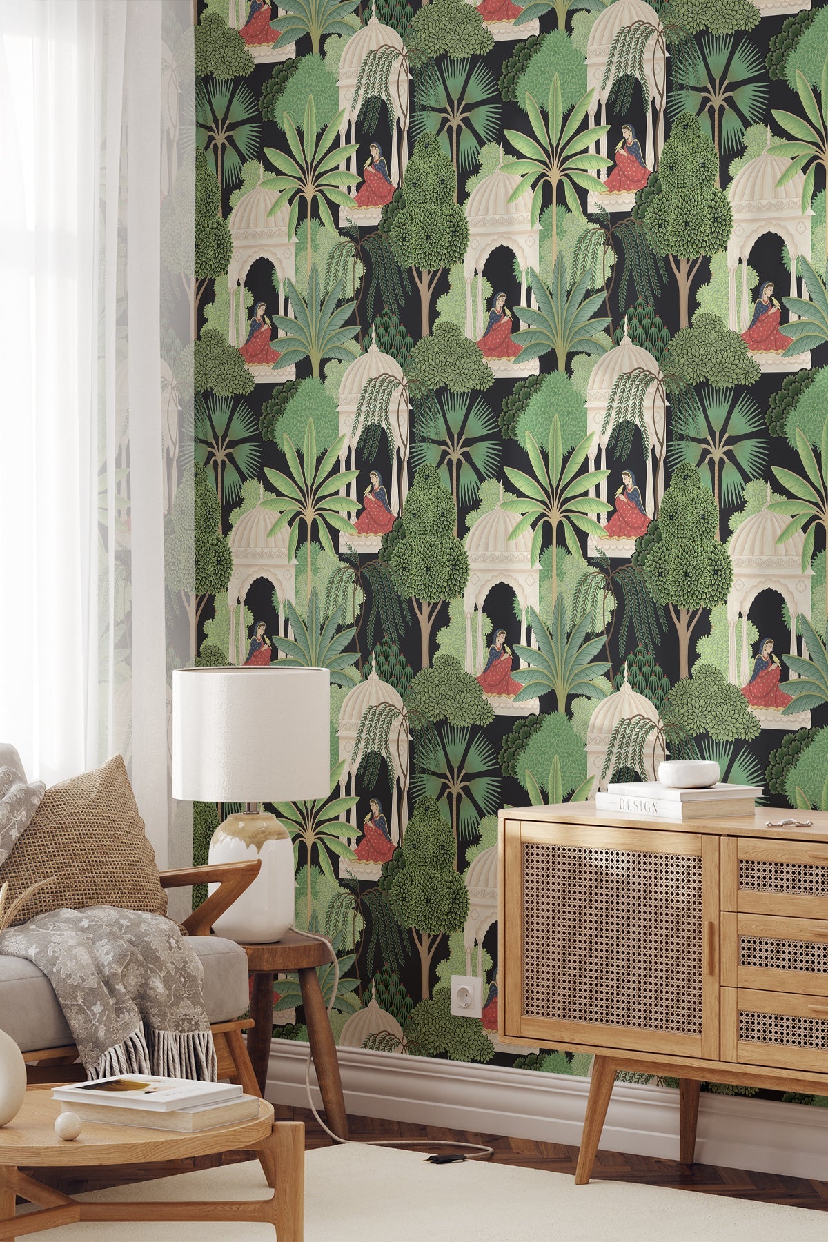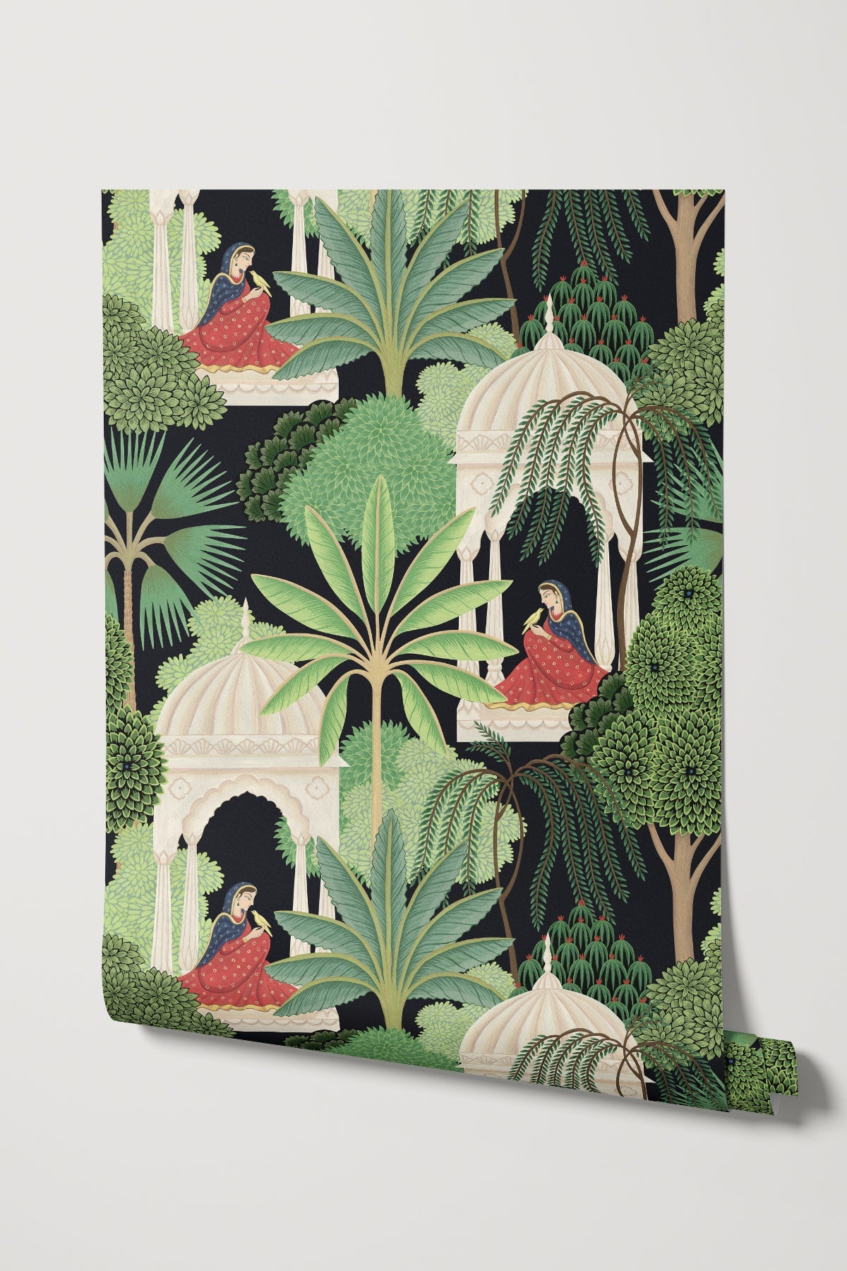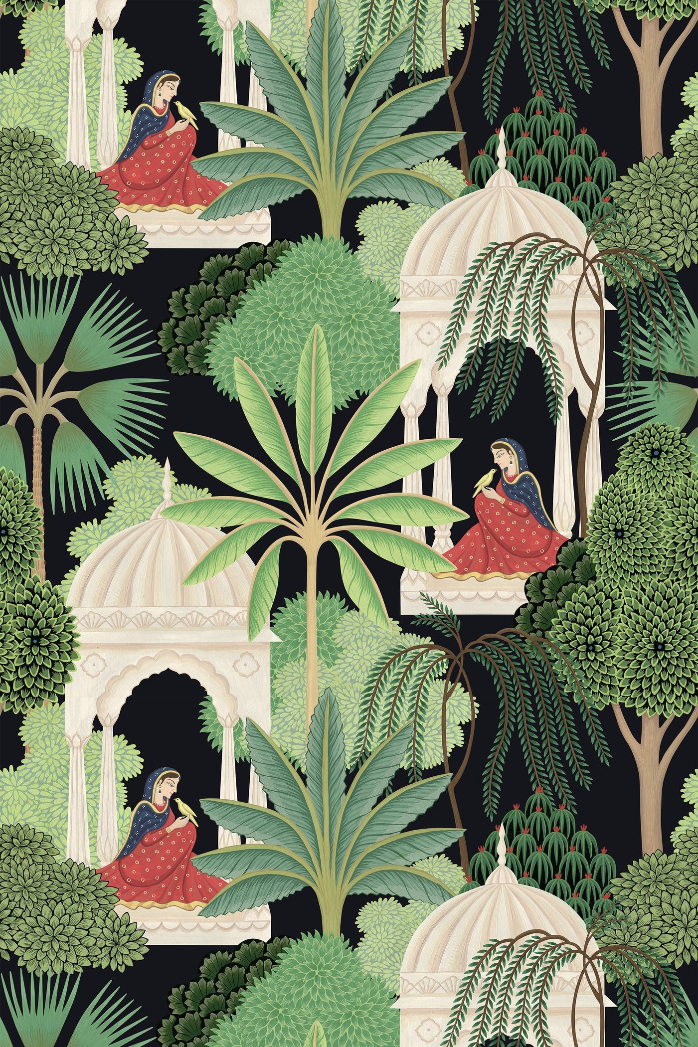 Our Uttar Pradesh Wallpaper is a mesmerizing wallpaper that pays homage to the rich heritage of Indian flora, its architecture and its people, in a distinct Mughal-inspired style. It is an intricate dance of vibrant botanicals, with each stroke meticulously crafted in the lush opulence of gouache.